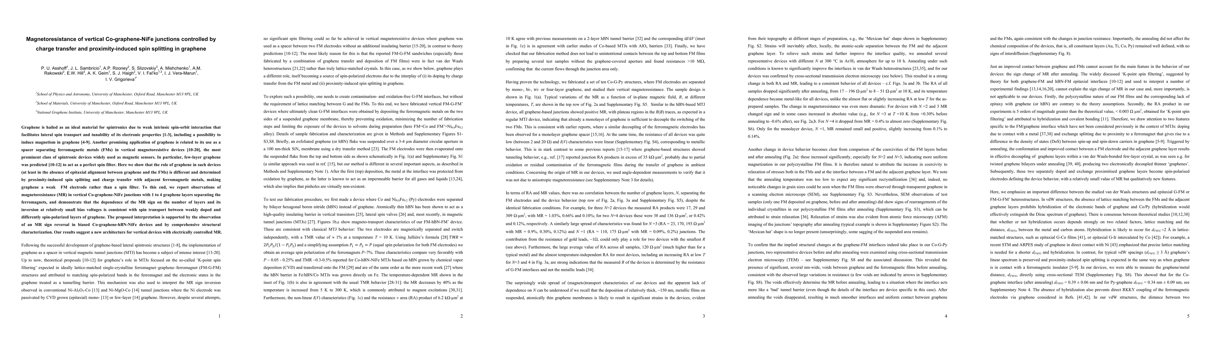 This paper investigates the magnetoresistance in vertical Co-graphene-NiFe junctions, revealing that graphene acts as a weak ferromagnetic electrode due to proximity-induced spin splitting and charge transfer, rather than a perfect spin filter. The findings suggest a new architecture for spintronic devices with electrically tunable magnetoresistance.
