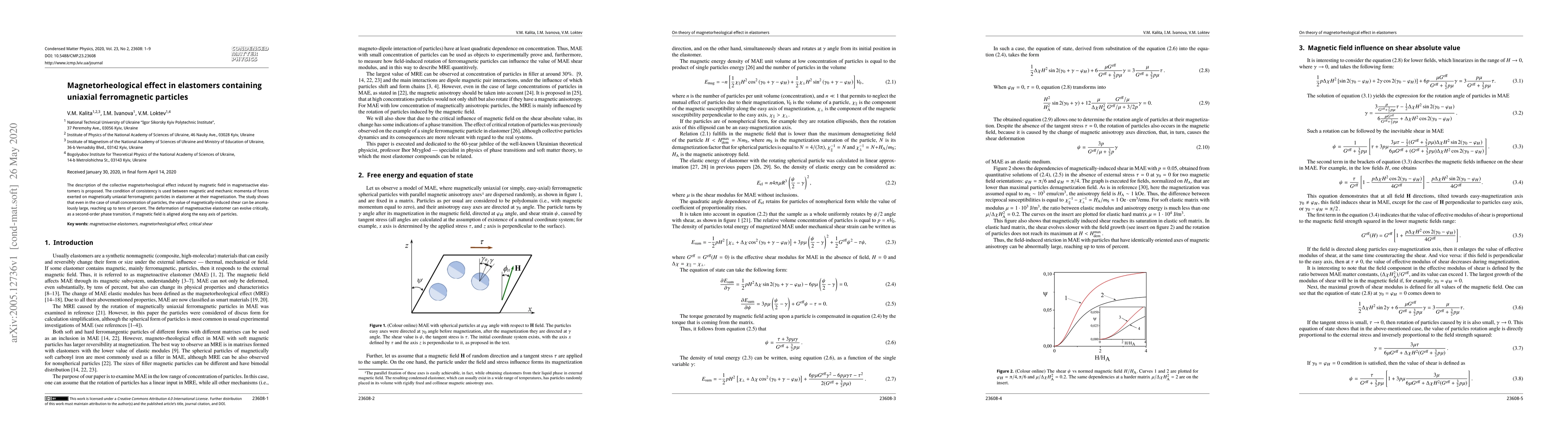 This paper proposes a model for the magnetorheological effect in elastomers with uniaxial ferromagnetic particles, showing that small particle concentrations can induce large magnetically-induced shears. The deformation of the elastomer can undergo a critical, second-order phase transition when the magnetic field aligns with the particles' easy axis.