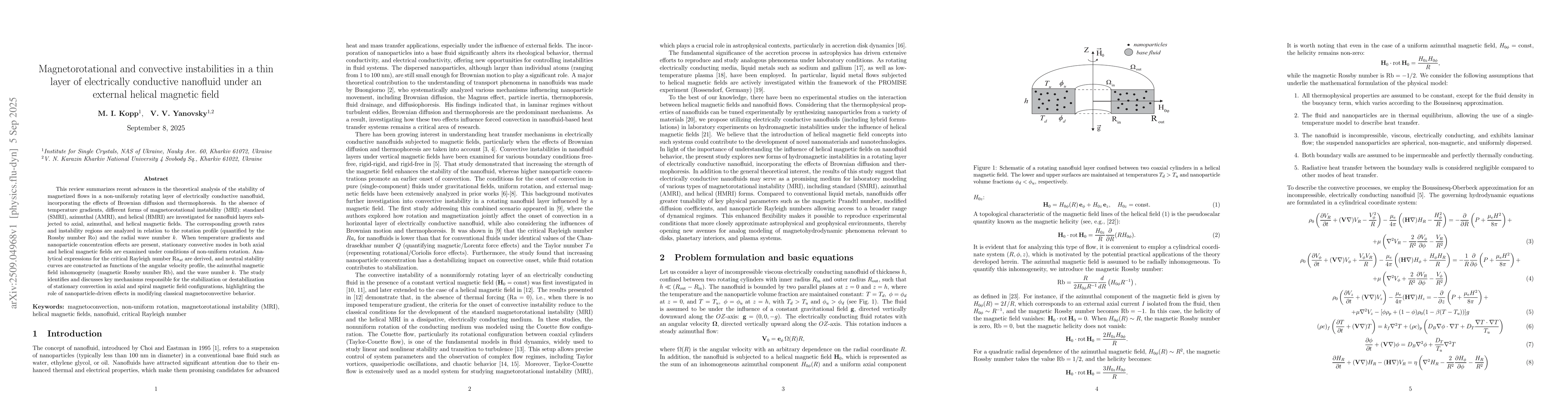 This review summarizes recent advances in the theoretical analysis of the stability of magnetized flows in a non-uniformly rotating layer of electrically conductive nanofluid, incorporating the effects of Brownian diffusion and thermophoresis. In the absence of temperature gradients, different forms of magnetorotational instability (MRI): standard (SMRI), azimuthal (AMRI), and helical (HMRI) are investigated for nanofluid layers subjected to axial, azimuthal, and helical magnetic fields. The corresponding growth rates and instability regions are analyzed in relation to the rotation profile (quantified by the Rossby number $\textrm{Ro}$) and the radial wave number $k$. When temperature gradients and nanoparticle concentration effects are present, stationary convective modes in both axial and helical magnetic fields are examined under conditions of non-uniform rotation. Analytical expressions for the critical Rayleigh number $\textrm{Ra}_{st}$ are derived, and neutral stability curves are constructed as functions of the angular velocity profile, the azimuthal magnetic field inhomogeneity (magnetic Rossby number $\textrm{Rb}$), and the wave number $k$. The study identifies and discusses key mechanisms responsible for the stabilization or destabilization of stationary convection in axial and spiral magnetic field configurations, highlighting the role of nanoparticle-driven effects in modifying classical magnetoconvective behavior.