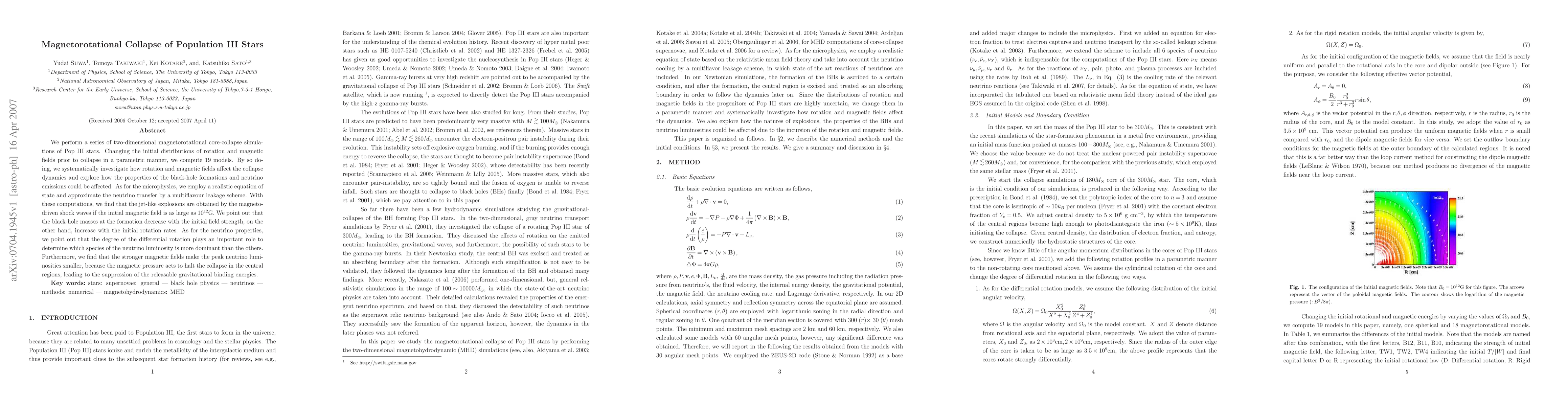 We perform a series of two-dimensional magnetorotational core-collapse simulations of Pop III stars. Changing the initial distributions of rotation and magnetic fields prior to collapse in a parametric manner, we compute 19 models. By so doing, we systematically investigate how rotation and magnetic fields affect the collapse dynamics and explore how the properties of the black-hole formations and neutrino emissions could be affected. As for the microphysics, we employ a realistic equation of state and approximate the neutrino transfer by a multiflavour leakage scheme. With these computations, we find that the jet-like explosions are obtained by the magnetodriven shock waves if the initial magnetic field is as large as $10^{12}$ G. We point out that the black-hole masses at the formation decrease with the initial field strength, on the other hand, increase with the initial rotation rates. As for the neutrino properties, we point out that the degree of the differential rotation plays an important role to determine which species of the neutrino luminosity is more dominant than the others. Furthermore, we find that the stronger magnetic fields make the peak neutrino luminosities smaller, because the magnetic pressure acts to halt the collapse in the central regions, leading to the suppression of the releasable gravitational binding energies.