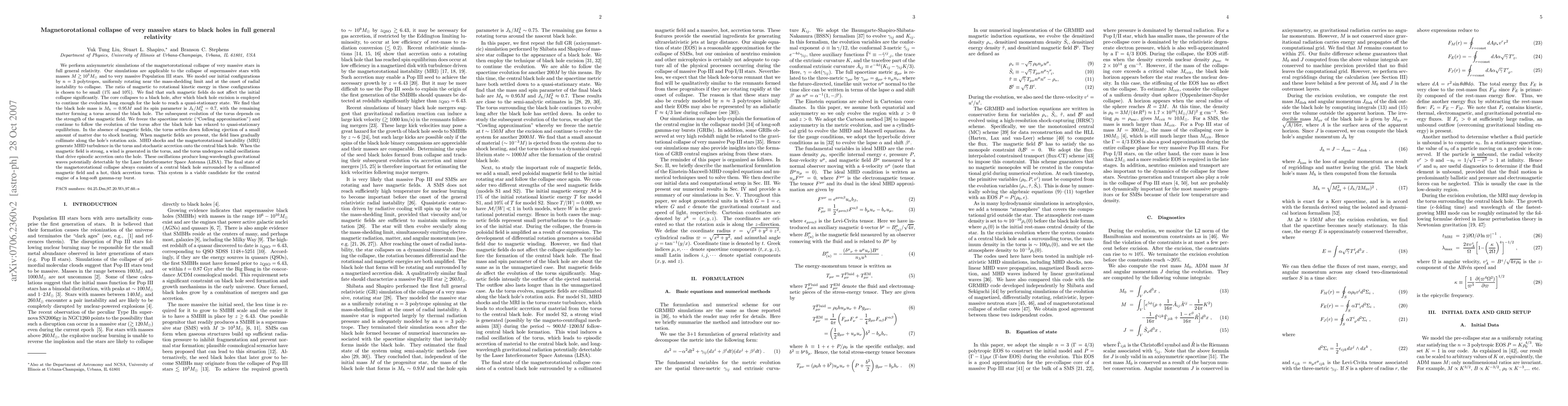 We perform axisymmetric simulations of the magnetorotational collapse of very massive stars in full general relativity. Our simulations are applicable to the collapse of supermassive stars (M > 10^3M_sun) and to very massive Pop III stars. We model our initial configurations by n=3 polytropes. The ratio of magnetic to rotational kinetic energy in these configurations is chosen to be small (1% and 10%). We find that such magnetic fields do not affect the initial collapse significantly. The core collapses to a black hole, after which black hole excision is employed to continue the evolution long enough for the hole to reach a quasi-stationary state. We find that the black hole mass is M_h = 0.95M and its spin parameter is J_h/M_h^2 = 0.7, with the remaining matter forming a torus around the black hole. We freeze the spacetime metric ("Cowling approximation") and continue to follow the evolution of the torus after the black hole has relaxed to quasi-stationary equilibrium. In the absence of magnetic fields, the torus settles down following ejection of a small amount of matter due to shock heating. When magnetic fields are present, the field lines gradually collimate along the hole's rotation axis. MHD shocks and the MRI generate MHD turbulence in the torus and stochastic accretion onto the central black hole. When the magnetic field is strong, a wind is generated in the torus, and the torus undergoes radial oscillations that drive episodic accretion onto the hole. These oscillations produce long-wavelength gravitational waves potentially detectable by LISA. The final state of the magnetorotational collapse always consists of a central black hole surrounded by a collimated magnetic field and a hot, thick accretion torus. This system is a viable candidate for the central engine of a long-soft gamma-ray burst.