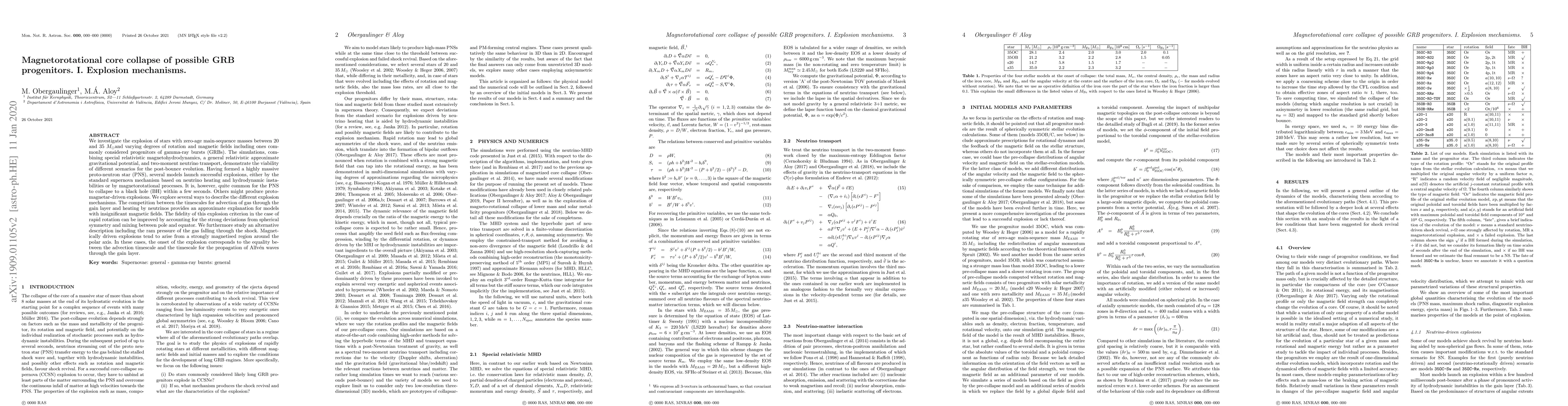 We investigate the explosion of stars with zero-age main-sequence masses between 20 and 35 solar masses and varying degrees of rotation and magnetic fields including ones commonly considered progenitors of gamma-ray bursts (GRBs). The simulations, combining special relativistic magnetohydrodynamics, a general relativistic approximate gravitational potential, and two-moment neutrino transport, demonstrate the viability of different scenarios for the post-bounce evolution. Having formed a highly massive proto-neutron star (PNS), several models launch successful explosions, either by the standard supernova mechanism based on neutrino heating and hydrodynamic instabilities or by magnetorotational processes. It is, however, quite common for the PNS to collapse to a black hole (BH) within a few seconds. Others might produce proto-magnetar-driven explosions. We explore several ways to describe the different explosion mechanisms. The competition between the timescales for advection of gas through the gain layer and heating by neutrinos provides an approximate explanation for models with insignificant magnetic fields. The fidelity of this explosion criterion in the case of rapid rotation can be improved by accounting for the strong deviations from spherical symmetry and mixing between pole and equator. We furthermore study an alternative description including the ram pressure of the gas falling through the shock. Magnetically driven explosions tend to arise from a strongly magnetised region around the polar axis. In these cases, the onset of the explosion corresponds to the equality between the advection timescale and the timescale for the propagation of Alfv\'en waves through the gain layer.