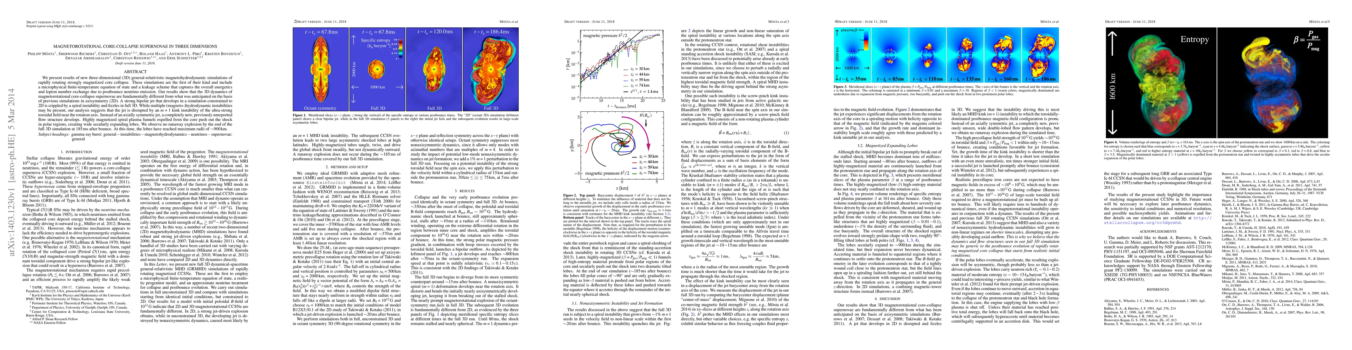 We present results of new three-dimensional (3D) general-relativistic magnetohydrodynamic simulations of rapidly rotating strongly magnetized core collapse. These simulations are the first of their kind and include a microphysical finite-temperature equation of state and a leakage scheme that captures the overall energetics and lepton number exchange due to postbounce neutrino emission. Our results show that the 3D dynamics of magnetorotational core-collapse supernovae are fundamentally different from what was anticipated on the basis of previous simulations in axisymmetry (2D). A strong bipolar jet that develops in a simulation constrained to 2D is crippled by a spiral instability and fizzles in full 3D. While multiple (magneto-)hydrodynamic instabilities may be present, our analysis suggests that the jet is disrupted by an m=1 kink instability of the ultra-strong toroidal field near the rotation axis. Instead of an axially symmetric jet, a completely new, previously unreported flow structure develops. Highly magnetized spiral plasma funnels expelled from the core push out the shock in polar regions, creating wide secularly expanding lobes. We observe no runaway explosion by the end of the full 3D simulation at 185 ms after bounce. At this time, the lobes have reached maximum radii of 900 km.