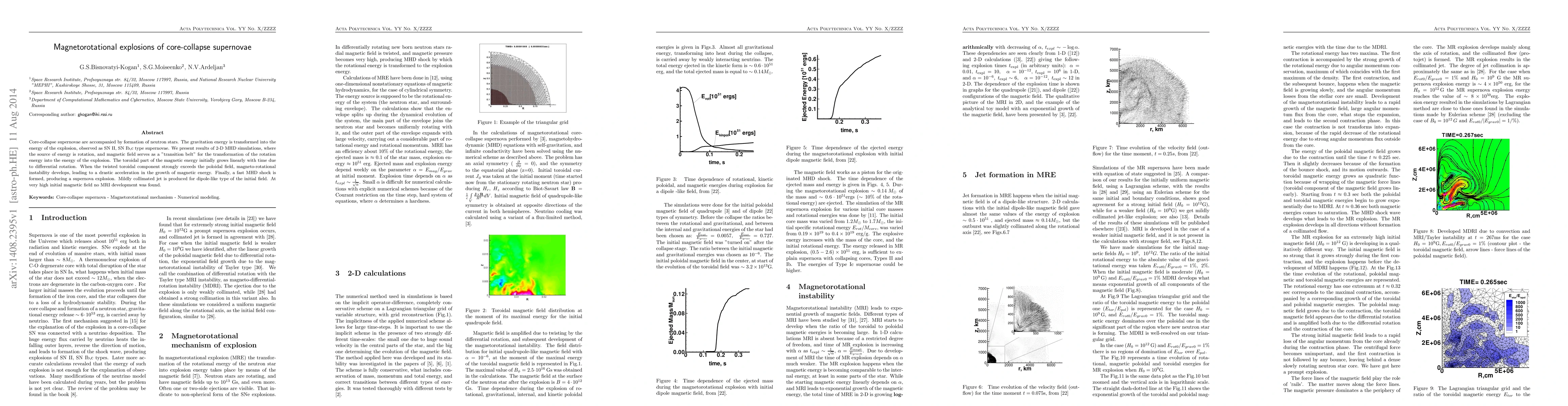 Core-collapse supernovae are accompanied by formation of neutron stars. The gravitation energy is transformed into the energy of the explosion, observed as SN II, SN Ib,c type supernovae. We present results of 2-D MHD simulations, where the source of energy is rotation, and magnetic field serves as a "transition belt" for the transformation of the rotation energy into the energy of the explosion. The toroidal part of the magnetic energy initially grows linearly with time due to differential rotation. When the twisted toroidal component strongly exceeds the poloidal field, magneto-rotational instability develops, leading to a drastic acceleration in the growth of magnetic energy. Finally, a fast MHD shock is formed, producing a supernova explosion. Mildly collimated jet is produced for dipole-like type of the initial field. At very high initial magnetic field no MRI development was found.