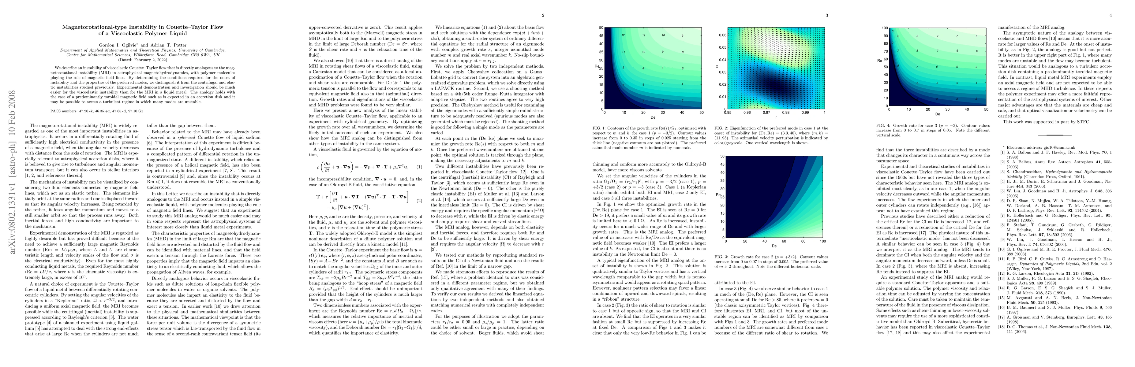 This paper investigates a magnetorotational-type instability in viscoelastic Couette-Taylor flow, analogous to magnetorotational instability in astrophysical contexts, where polymer molecules mimic magnetic field lines. The study identifies conditions for instability onset and preferred modes, distinguishing it from centrifugal and elastic instabilities.