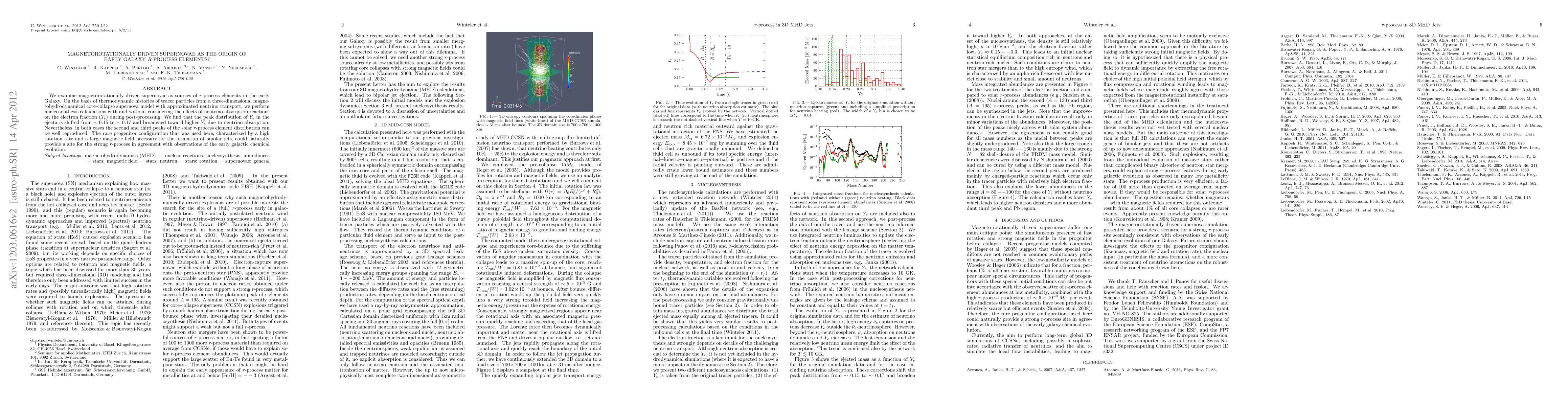 This study explores magnetorotationally driven supernovae as sources of 'r'-process elements in early galaxies. Using 3D magnetohydrodynamical core-collapse supernova models, it finds that neutrino absorption reactions shift and broaden the electron fraction distribution in the ejecta, yet both scenarios reproduce the second and third peaks of the solar 'r'-process element distribution. The rare progenitor configuration with high rotation and strong magnetic fields could explain the strong 'r'-process observed in early galactic chemical evolution.