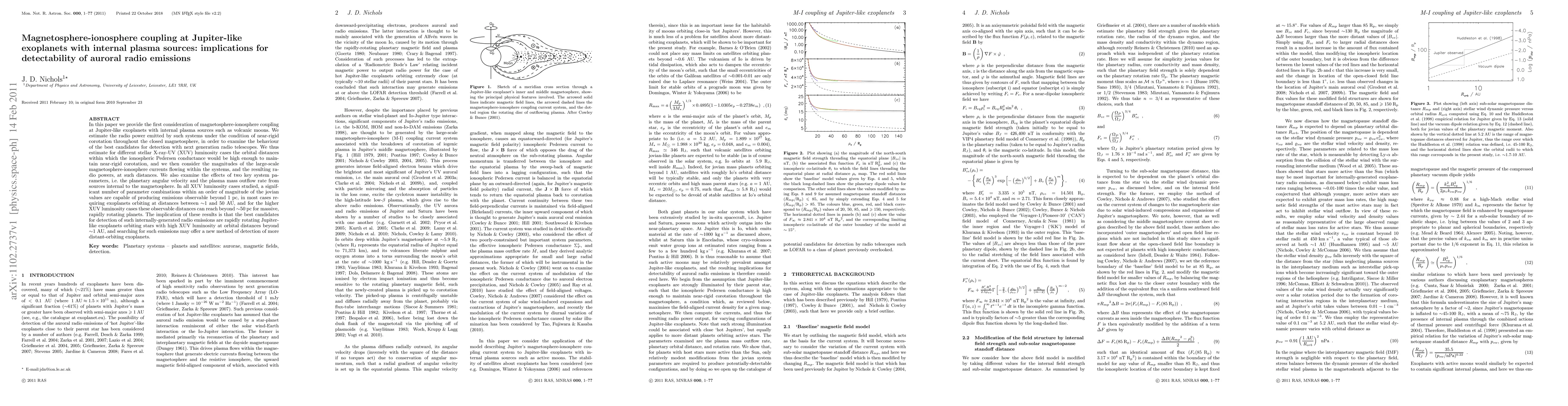 This paper investigates magnetosphere-ionosphere coupling at Jupiter-like exoplanets with internal plasma sources, estimating radio emissions' detectability with next-generation radio telescopes. It finds that rapidly rotating exoplanets with high stellar XUV luminosity, orbiting at distances beyond ~1 AU, are the best candidates for detecting these emissions, offering a new method for discovering distant exoplanets.