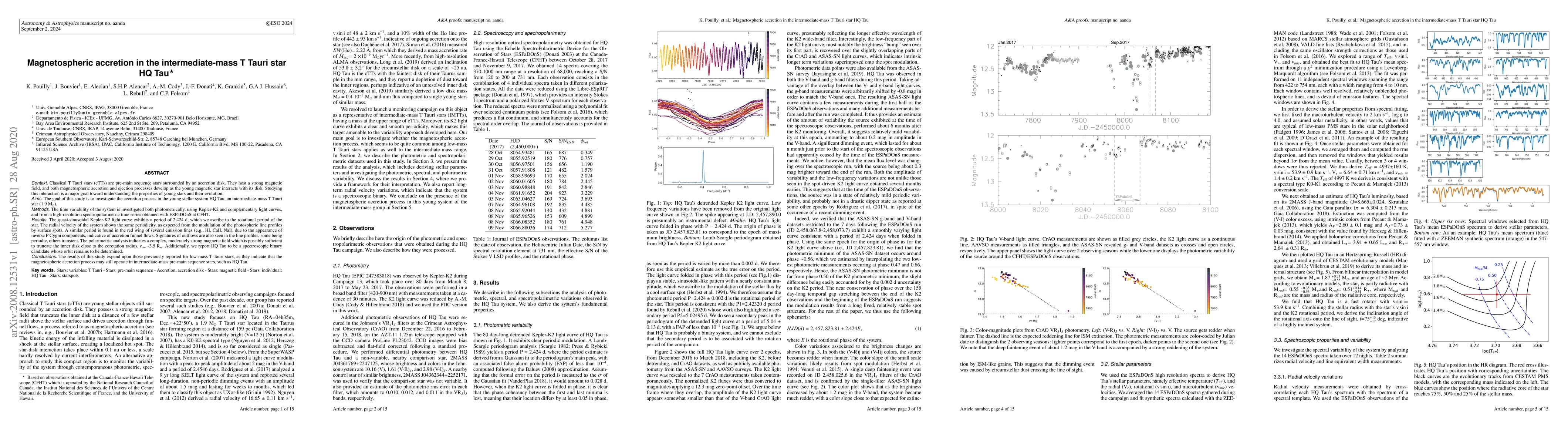 Context. Classical T Tauri stars (cTTs) are pre-main sequence stars surrounded by an accretion disk. They host a strong magnetic field, and both magnetospheric accretion and ejection processes develop as the young magnetic star interacts with its disk. Studying this interaction is a major goal toward understanding the properties of young stars and their evolution. Aims. The goal of this study is to investigate the accretion process in the young stellar system HQ Tau, an intermediate-mass T Tauri star (1.9 M$_{\odot}$). Methods. The time variability of the system is investigated both photometrically, using Kepler-K2 and complementary light curves, and from a high-resolution spectropolarimetric time series obtained with ESPaDOnS at CFHT. Results. The quasi-sinusoidal Kepler-K2 light curve exhibits a period of 2.424 d, which we ascribe to the rotational period of the star. The radial velocity of the system shows the same periodicity, as expected from the modulation of the photospheric line profiles by surface spots. A similar period is found in the red wing of several emission lines (e.g., HI, CaII, NaI), due to the appearance of inverse P Cygni components, indicative of accretion funnel flows. Signatures of outflows are also seen in the line profiles, some being periodic, others transient. The polarimetric analysis indicates a complex, moderately strong magnetic field which is possibly sufficient to truncate the inner disk close to the corotation radius, r$_{cor}$ $\sim$3.5 R$_{\star}$. Additionally, we report HQ Tau to be a spectroscopic binary candidate whose orbit remains to be determined. Conclusions. The results of this study expand upon those previously reported for low-mass T Tauri stars, as they indicate that the magnetospheric accretion process may still operate in intermediate-mass pre-main sequence stars, such as HQ Tau.