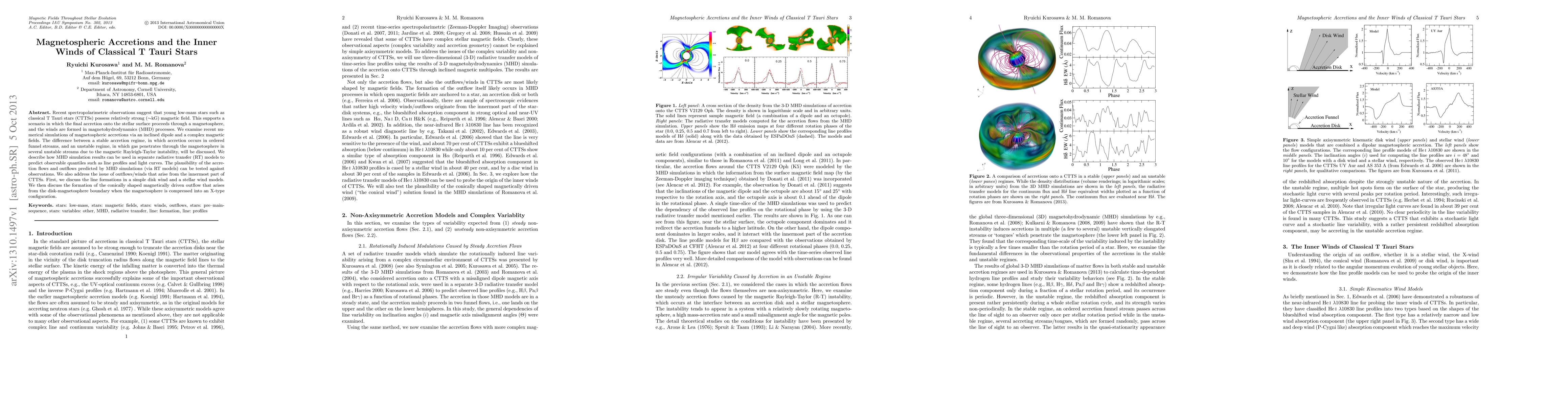 This paper explores the magnetospheric accretion processes and inner winds in classical T Tauri stars (CTTSs) using numerical simulations and radiative transfer models. It examines stable and unstable accretion regimes and discusses the formation of outflows driven by magnetohydrodynamics (MHD) processes, comparing these predictions with observational data.