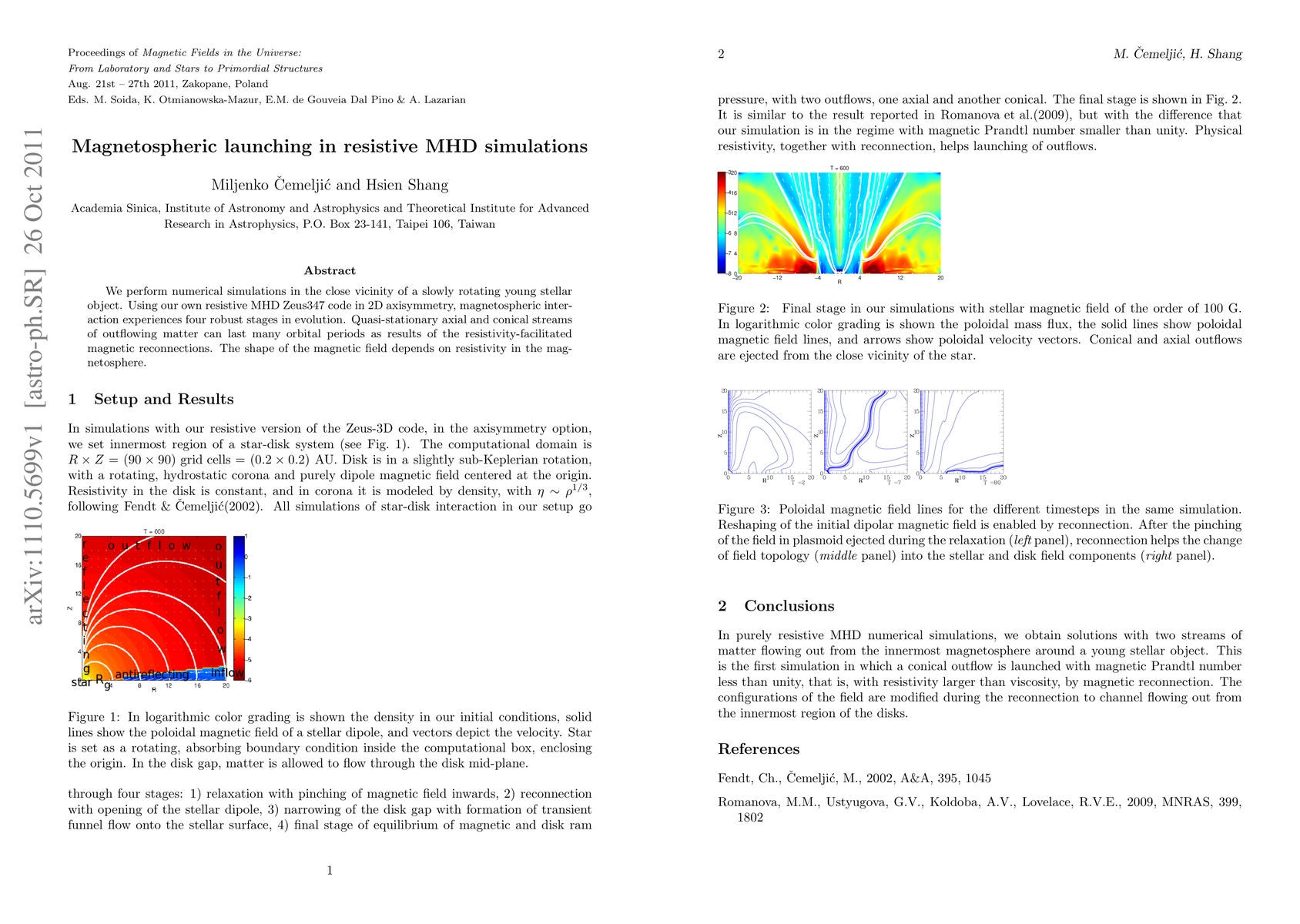 We perform numerical simulations in the close vicinity of a slowly rotating young stellar object. Using our own resistive MHD Zeus347 code in 2D axisymmetry, magnetospheric interaction experiences four robust stages in evolution. Quasi-stationary axial and conical streams of outflowing matter can last many orbital periods as results of the resistivity-facilitated magnetic reconnections. The shape of the magnetic field depends on resistivity in the magnetosphere.