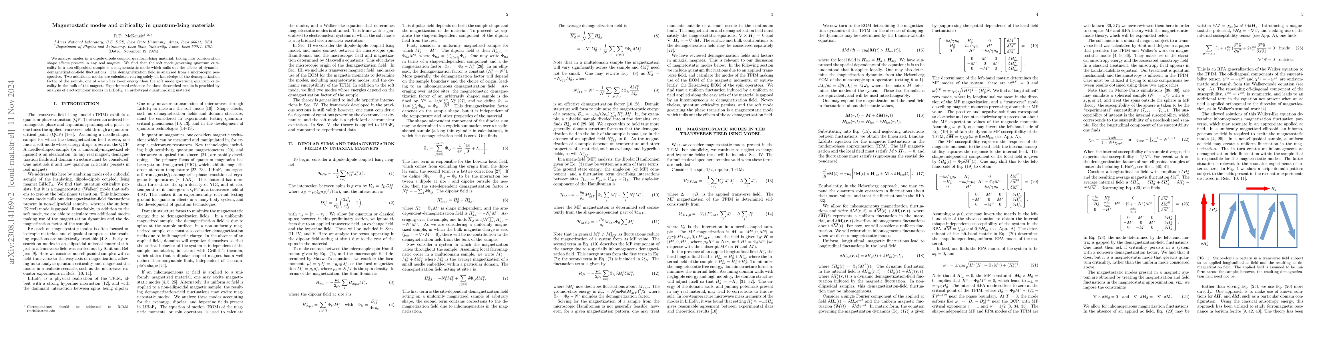 We analyze modes in a dipole-dipole coupled quantum magnetic material, taking into consideration domain structure and other shape effects present in any real magnet. We find that the soft mode governing quantum criticality in a non-ellipsoidal sample is an inhomogeneous magnetostatic mode which negates dynamic, demagnetization-field effects. The demagnetization field is analyzed from a microscopic perspective. Furthermore, we find a magnetostatic mode originating from variations in the magnetization of the sample, caused by domain structure and quantum or thermal fluctuations, will be lower in energy than the soft mode governing quantum criticality in the bulk of the magnet. Experimental evidence for these theoretical results is provided by analysis of electronuclear modes in LiHoF$_4$, an archetypal dipolar quantum Ising material, in a microwave resonator.