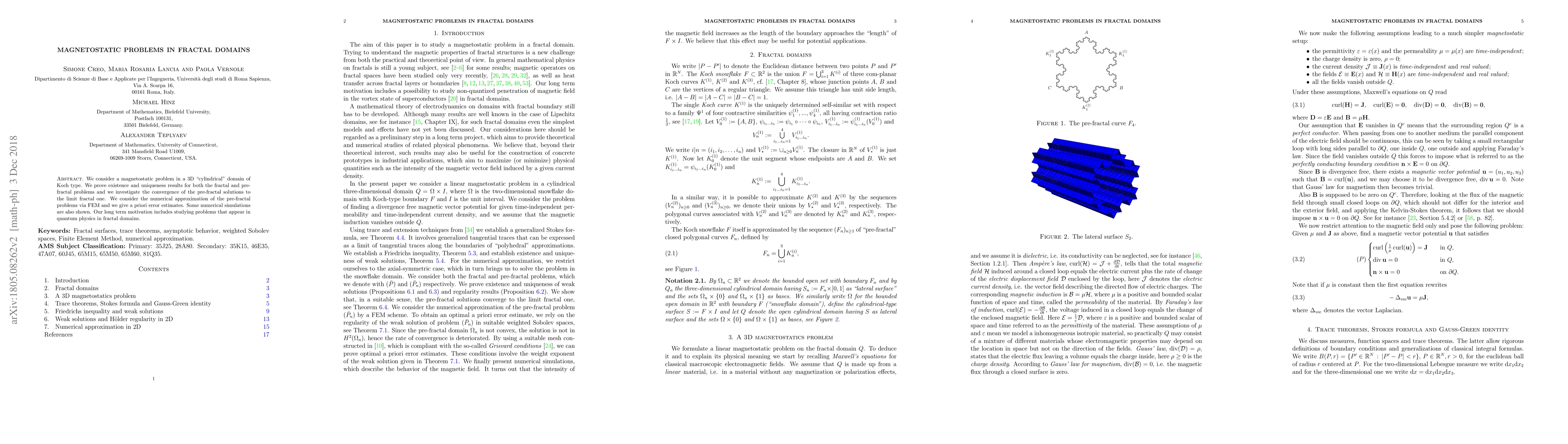 We consider a magnetostatic problem in a 3D "cylindrical" domain of Koch type. We prove existence and uniqueness results for both the fractal and pre-fractal problems and we investigate the convergence of the pre-fractal solutions to the limit fractal one. We consider the numerical approximation of the pre-fractal problems via FEM and we prove a priori error estimates. Some numerical simulations are also shown. Our long term motivation includes studying problems that appear in quantum physics in fractal domains.