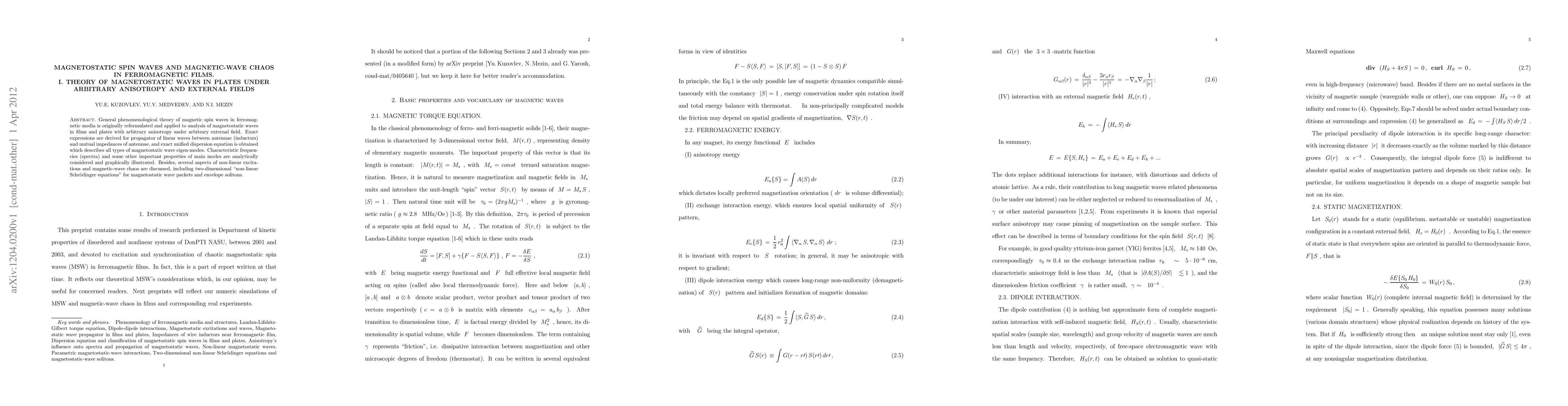 This paper reformulates the theory of magnetic spin waves in ferromagnetic media to analyze magnetostatic waves in films and plates with varying anisotropy and external fields. It derives exact expressions for wave propagation and dispersion, and discusses non-linear excitations and magnetic-wave chaos, including solitons and chaotic behavior.