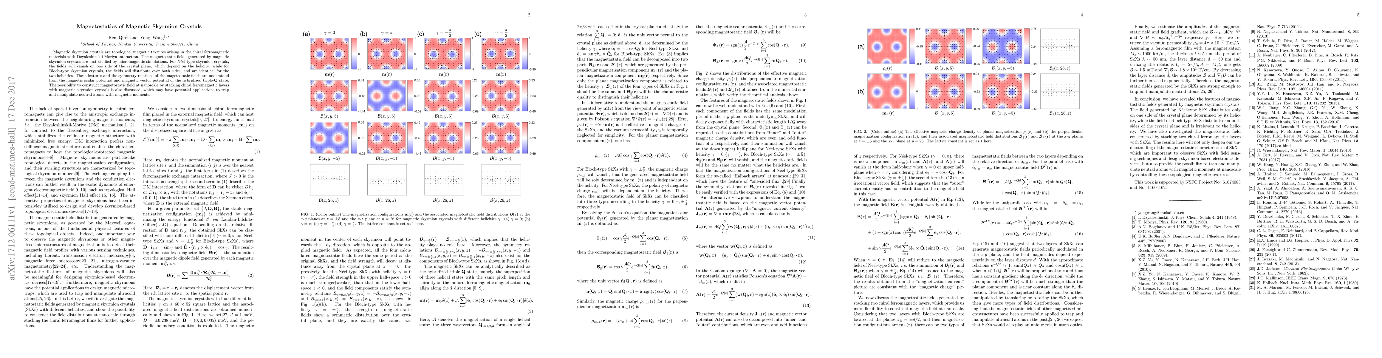 This paper investigates the magnetostatic fields generated by magnetic skyrmion crystals in chiral ferromagnetic materials, revealing distinct field distributions for N\'eel-type and Bloch-type skyrmions. The study suggests potential nanoscale applications for trapping and manipulating neutral atoms using stacked chiral ferromagnetic layers.