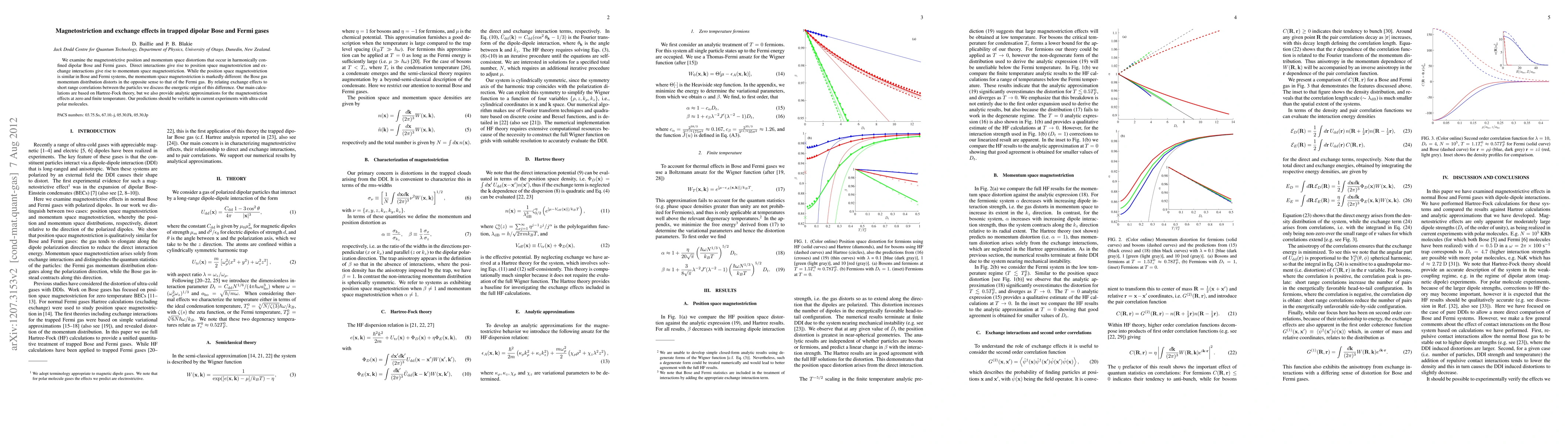 This paper investigates magnetostriction in trapped dipolar Bose and Fermi gases, finding that while position space distortions are similar, momentum space distortions differ significantly due to exchange interactions and short-range correlations, with predictions testable in current ultra-cold molecule experiments.