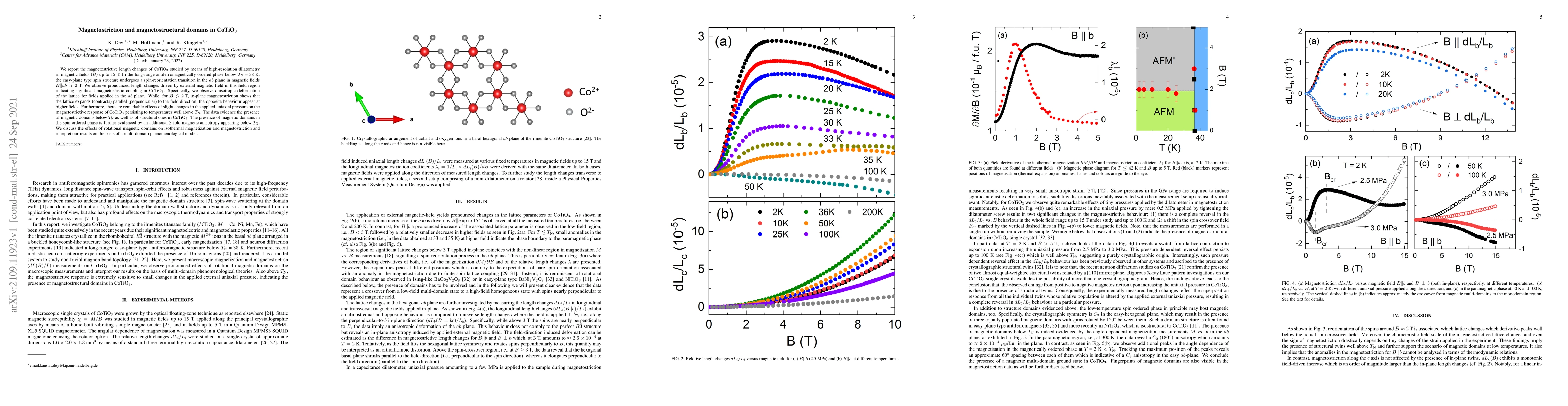 We report the magnetostrictive length changes of CoTiO$_3$ studied by means of high-resolution dilatometry in magnetic fields ($B$) up to 15~T. In the long-range antiferromagnetically ordered phase below $T_N$ = 38~K, the easy-plane type spin structure undergoes a spin-reorientation transition in the $ab$ plane in magnetic fields $B || ab \approx 2$~T. We observe pronounced length changes driven by external magnetic field in this field region indicating significant magnetoelastic coupling in CoTiO$_3$. Specifically, we observe anisotropic deformation of the lattice for fields applied in the $ab$ plane. While, for $B \lesssim 2$~T, in-plane magnetostriction shows that the lattice expands (contracts) parallel (perpendicular) to the field direction, the opposite behaviour appear at higher fields. Furthermore, there are remarkable effects of slight changes in the applied uniaxial pressure on the magnetostrictive response of CoTiO$_3$ persisting to temperatures well above $T_N$. The data evidence the presence of magnetic domains below $T_N$ as well as of structural ones in CoTiO$_3$. The presence of magnetic domains in the spin ordered phase is further evidenced by an additional 3-fold magnetic anisotropy appearing below $T_N$. We discuss the effects of rotational magnetic domains on isothermal magnetization and magnetostriction and interpret our results on the basis of a multi-domain phenomenological model.