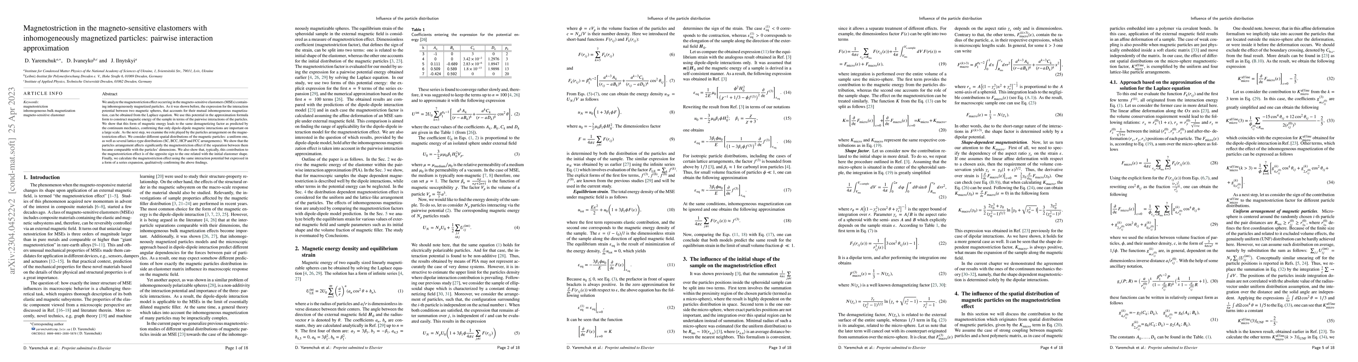 We analyze the magnetostriction effect occurring in the magneto-sensitive elastomers (MSEs) containing inhomogeneously magnetized particles. As it was shown before, the expression for the interaction potential between two magnetic spheres, that accounts for their mutual inhomogeneous magnetization, can be obtained from the Laplace equation. We use this potential in the approximation formula form to construct magnetic energy of the sample in terms of the pairwise interactions of the particles. We show that this form of magnetic energy leads to the same demagnetizing factor as predicted by the continuum mechanics, confirming that only dipole-dipole magnetic interactions are important on a large scale. As the next step, we examine the role played by the particles arrangement on the magnetostriction effect. We consider different spatial distributions of the magnetic particles: a uniform one, as well as several lattice-type distributions (SC, BCC, HCP and FCC arrangements). We show that the particles arrangement affects significantly the magnetostriction effect if the separation between them became comparable with the particles' dimensions. We also show that, typically, this contribution to the magnetostriction effect is of the opposite sign to the one related with the initial elastomer shape. Finally, we calculate the magnetostriction effect using the same interaction potential but expressed in a form of a series expansion, qualitatively confirming the above findings.