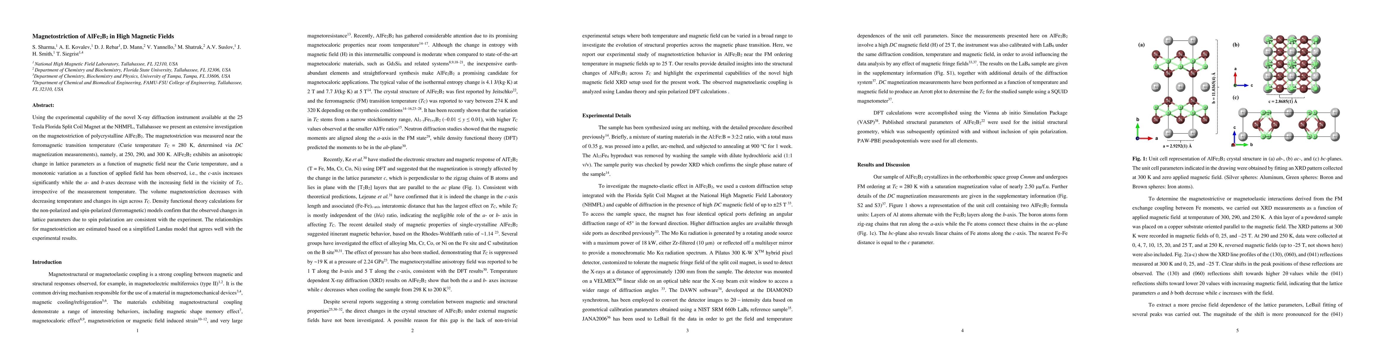 Using the experimental capability of the novel X-ray diffraction instrument available at the 25 Tesla Florida Split Coil Magnet at the NHMFL, Tallahassee we present an extensive investigation on the magnetostriction of polycrystalline AlFe2B2. The magnetostriction was measured near the ferromagnetic transition temperature (Curie temperature TC = 280 K, determined via DC magnetization measurements), namely, at 250, 290, and 300 K. AlFe2B2 exhibits an anisotropic change in lattice parameters as a function of magnetic field near the Curie temperature, and a monotonic variation as a function of applied field has been observed, i.e., the c-axis increases significantly while the a- and b-axes decrease with the increasing field in the vicinity of TC, irrespective of the measurement temperature. The volume magnetostriction decreases with decreasing temperature and changes its sign across TC. Density functional theory calculations for the non-polarized and spin-polarized (ferromagnetic) models confirm that the observed changes in lattice parameters due to spin polarization are consistent with the experiment. The relationships for magnetostriction are estimated based on a simplified Landau model that agrees well with the experimental results.