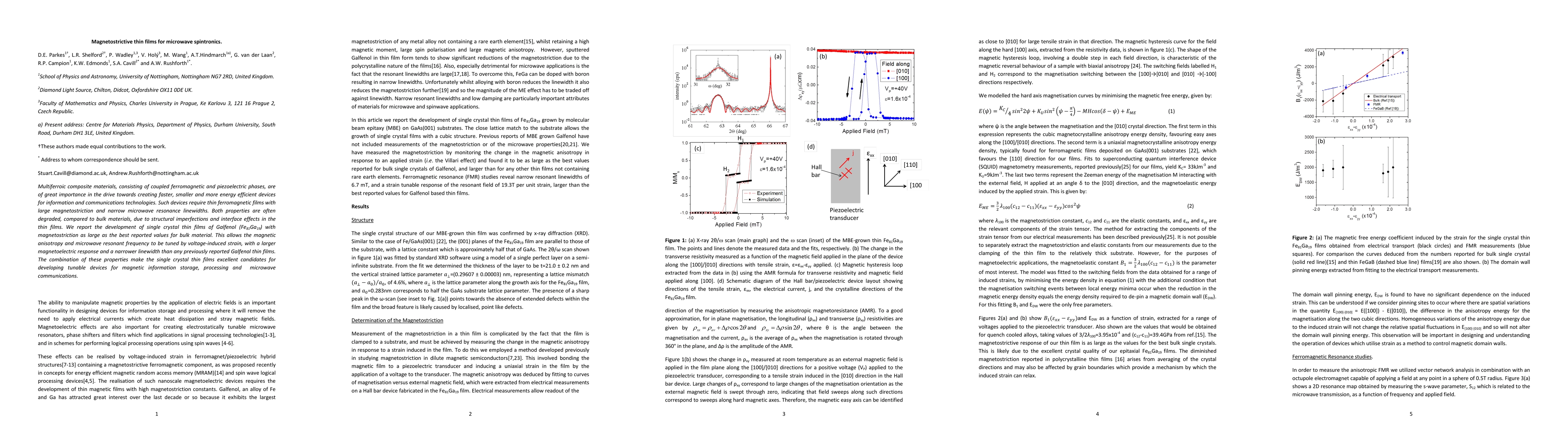 This paper reports the development of single crystal Galfenol thin films with large magnetostriction and narrow microwave resonance, enabling tunable magnetic anisotropy and microwave frequency via voltage-induced strain, surpassing previous thin film records and promising advancements in magnetic information storage and microwave communications.