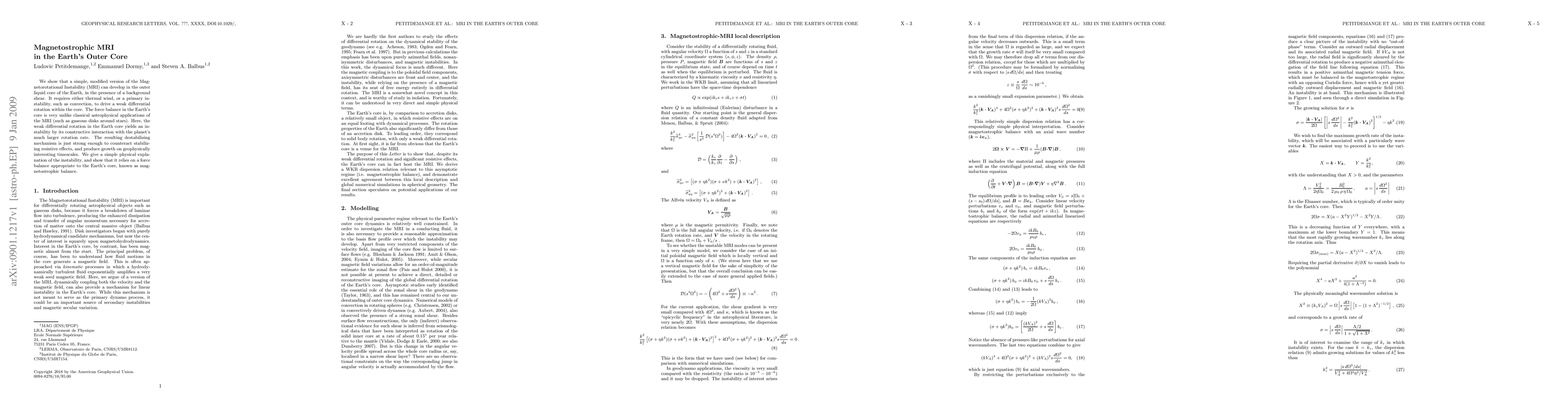 This paper demonstrates that a modified Magnetorotational Instability (MRI) can develop in the Earth's outer core due to a weak differential rotation driven by thermal wind or convection, interacting with the planet's rapid rotation. The instability, termed magnetostrophic MRI, balances forces specific to the Earth's core, enabling growth on geophysically relevant timescales.