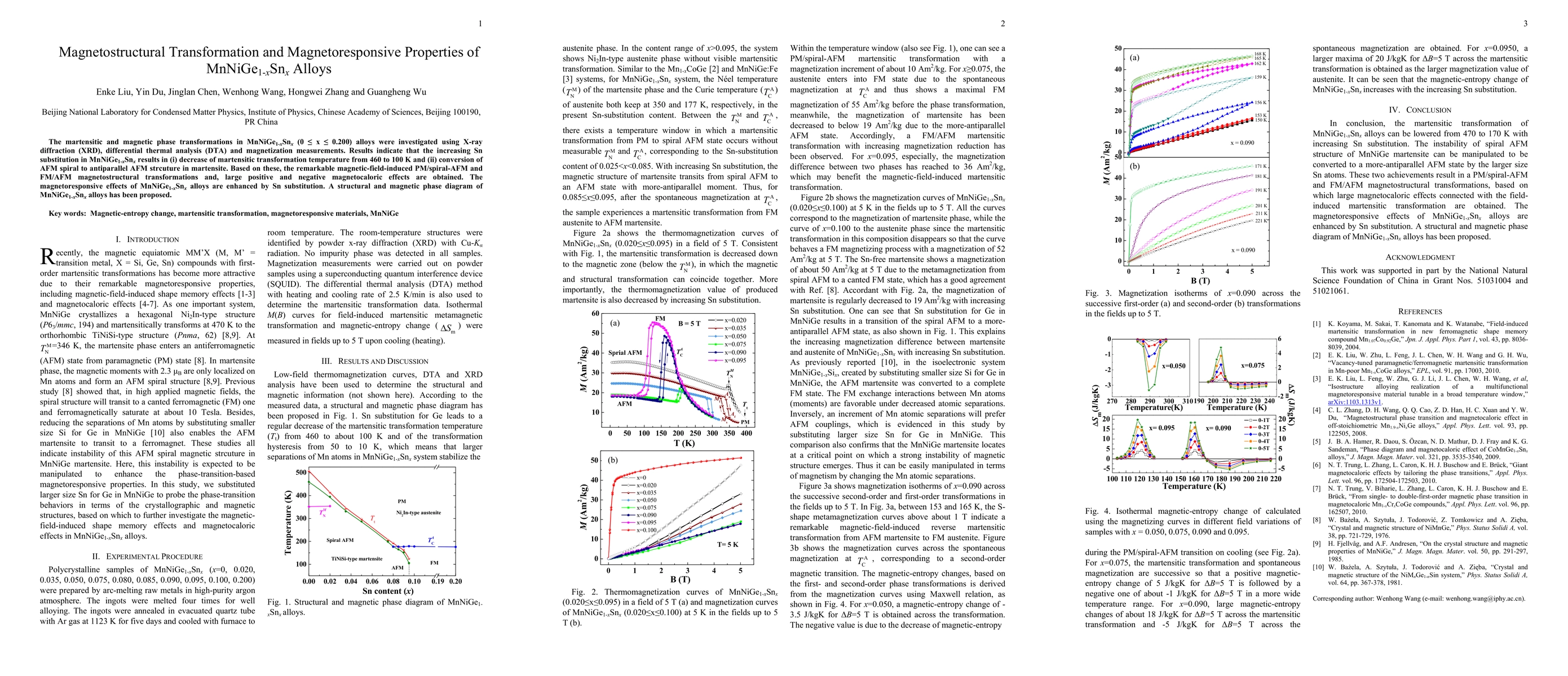 This study investigates the magnetostructural transformations in MnNiGe1-xSnx alloys, revealing that Sn substitution lowers martensitic transformation temperatures and alters magnetic structures. Enhanced magnetoresponsive properties and significant magnetocaloric effects are observed due to these transformations.