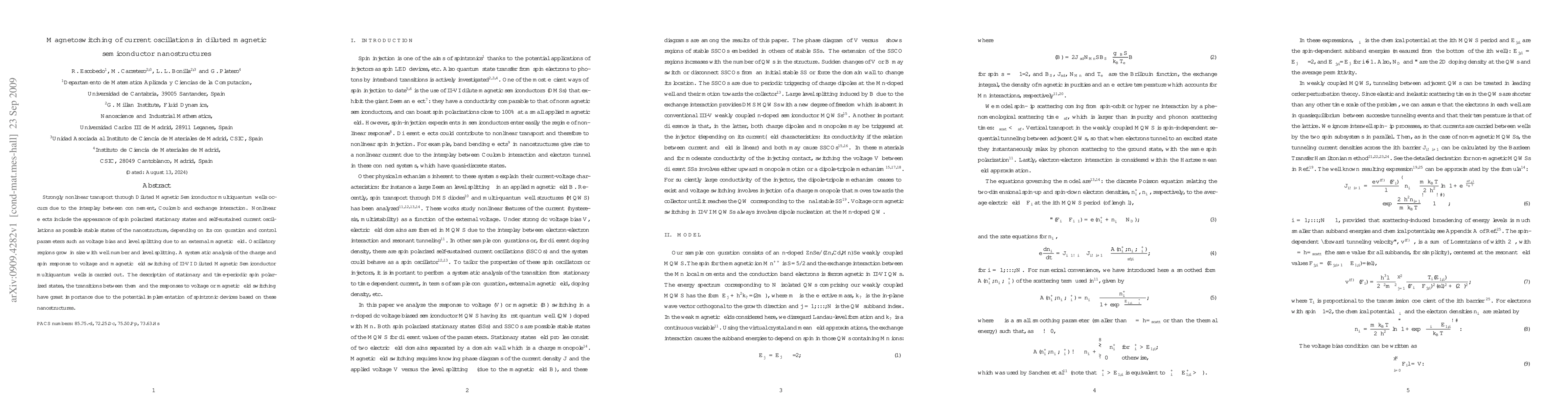 This paper investigates strongly nonlinear transport in Diluted Magnetic Semiconductor multiquantum wells, focusing on the magnetoswitching of current oscillations. It explores the interplay of confinement, Coulomb, and exchange interactions leading to spin-polarized states and self-sustained oscillations, with potential applications for spintronic devices.