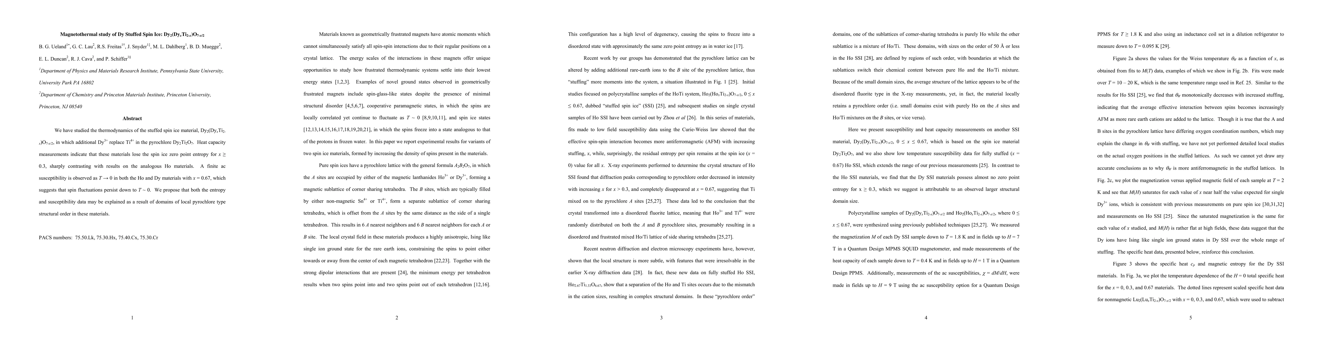 The study examines Dy2(DyxTi2-x)O7-x/2, a stuffed spin ice material. Heat capacity measurements show a loss of spin ice zero point entropy for x >= 0.3, contrasting with Ho materials. Finite ac susceptibility at low temperatures suggests persistent spin fluctuations, possibly due to local pyrochlore structural order domains.
