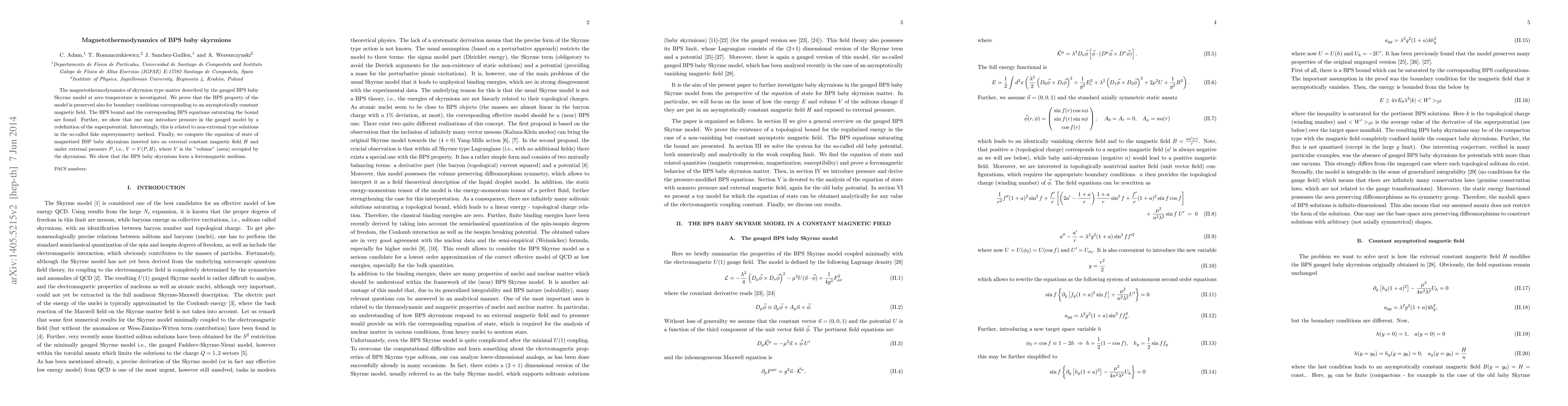 This paper investigates the magnetothermodynamics of BPS baby skyrmions described by a gauged BPS baby Skyrme model, proving that BPS properties persist under boundary conditions with an asymptotic magnetic field and computing their equation of state, revealing the skyrmions act as a ferromagnetic medium.