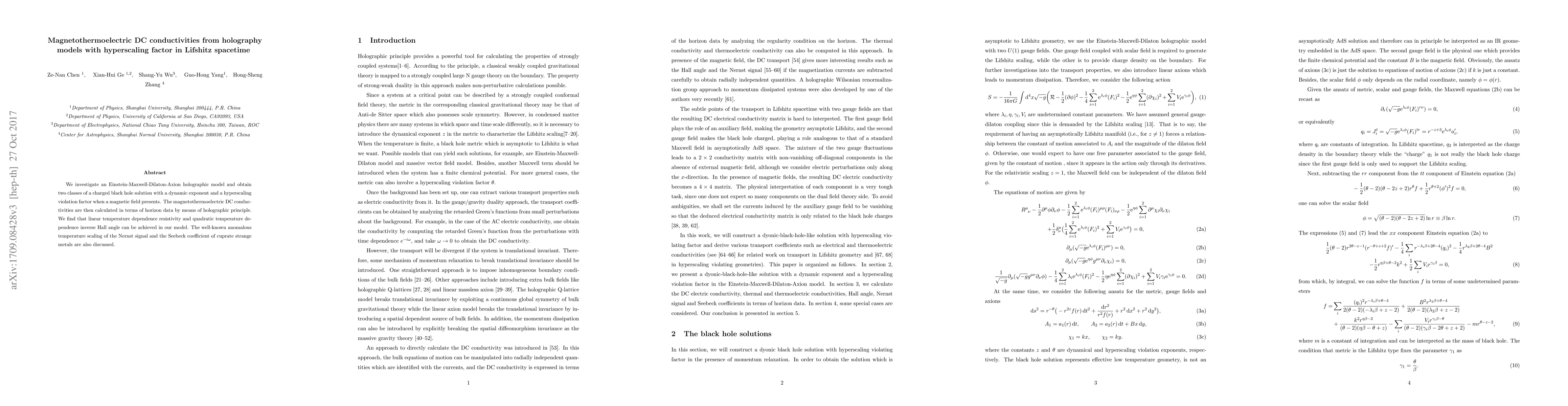 We investigate an Einstein-Maxwell-Dilaton-Axion holographic model and obtain two branches of a charged black hole solution with a dynamic exponent and a hyperscaling violation factor when a magnetic field presents. The magnetothermoelectric DC conductivities are then calculated in terms of horizon data by means of holographic principle. We find that linear temperature dependence resistivity and quadratic temperature dependence inverse Hall angle can be achieved in our model. The well-known anomalous temperature scaling of the Nernst signal and the Seebeck coefficient of cuprate strange metals are also discussed.