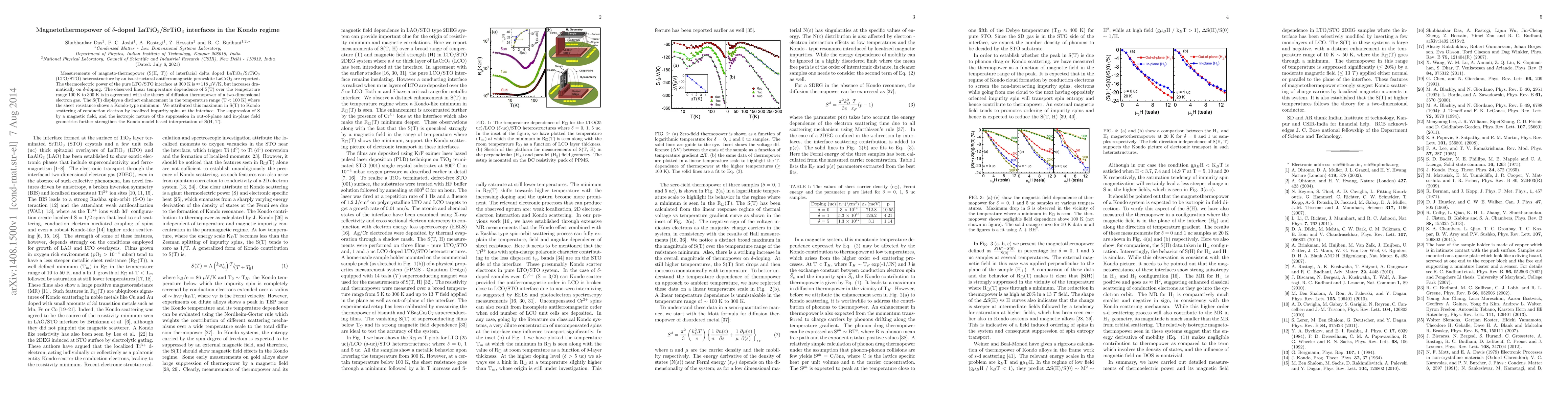 This study investigates the magneto-thermopower of delta-doped LaTiO$_3$/SrTiO$_3$ interfaces, revealing a significant increase in thermoelectric power upon doping. The observed linear temperature dependence and Kondo-type minimum in sheet resistance suggest strong Kondo scattering effects due to localized impurity spins at the interface.