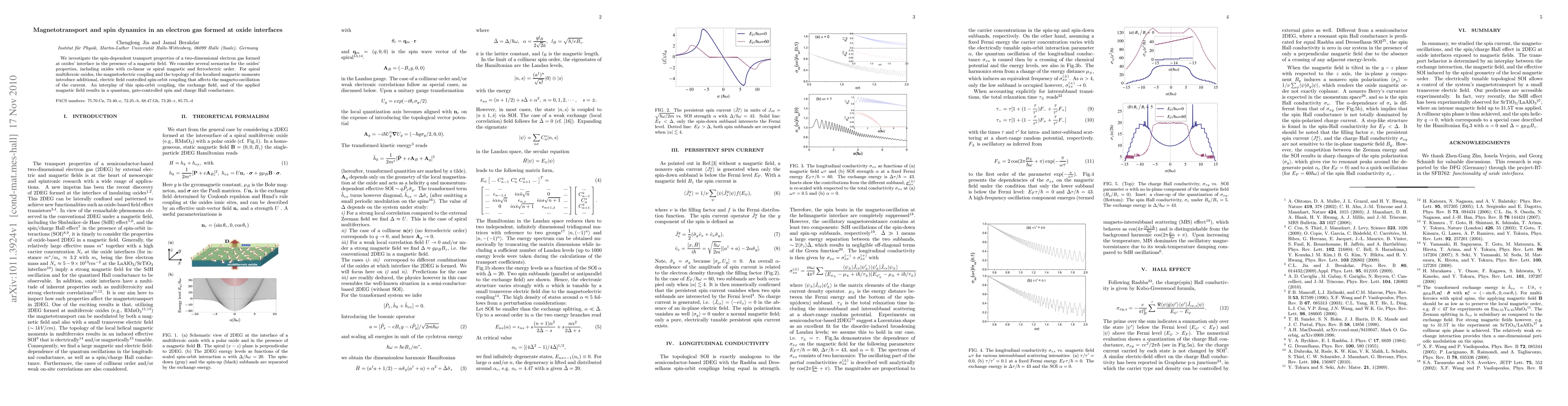 We investigate the spin-dependent transport properties of a two-dimensional electron gas formed at oxides' interface in the presence of a magnetic field. We consider several scenarios for the oxides' properties, including oxides with co-linear or spiral magnetic and ferroelectric order. For spiral multiferroic oxides, the magnetoelectric coupling and the topology of the localized magnetic moments introduce additional, electric field controlled spin-orbit coupling that affects the magneto-oscillation of the current. An interplay of this spin-orbit coupling, the exchange field, and of the applied magnetic field results in a quantum, gate-controlled spin and charge Hall conductance.