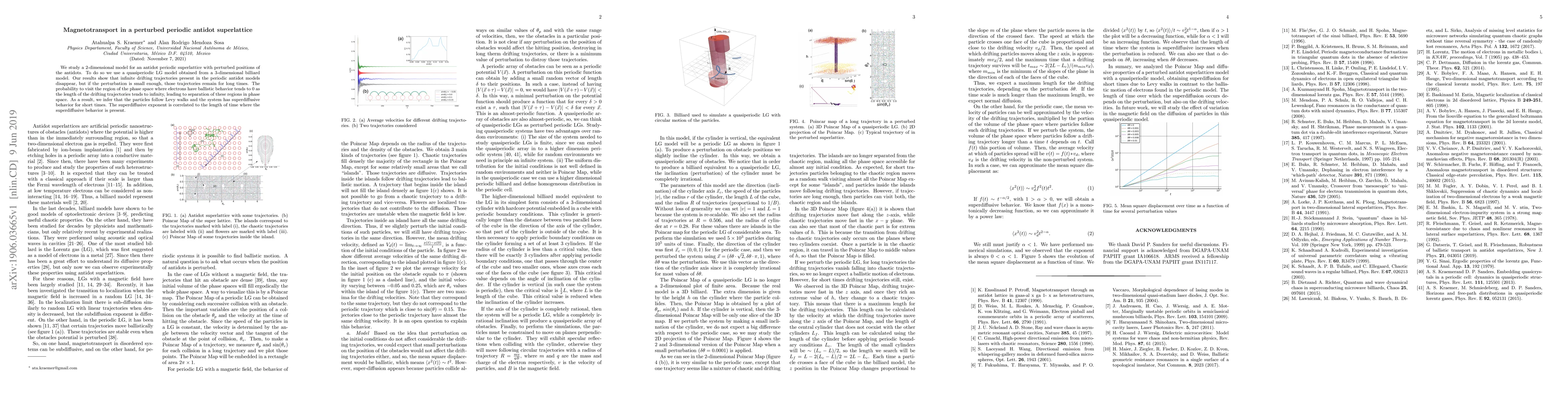 This paper investigates the magnetotransport in a 2D antidot superlattice with slightly perturbed antidot positions, revealing that while infinite drifting trajectories vanish, short-lived superdiffusive behavior persists for small perturbations. The study concludes that particles exhibit Lévy walks, with the superdiffusive exponent linked to the duration of this behavior.