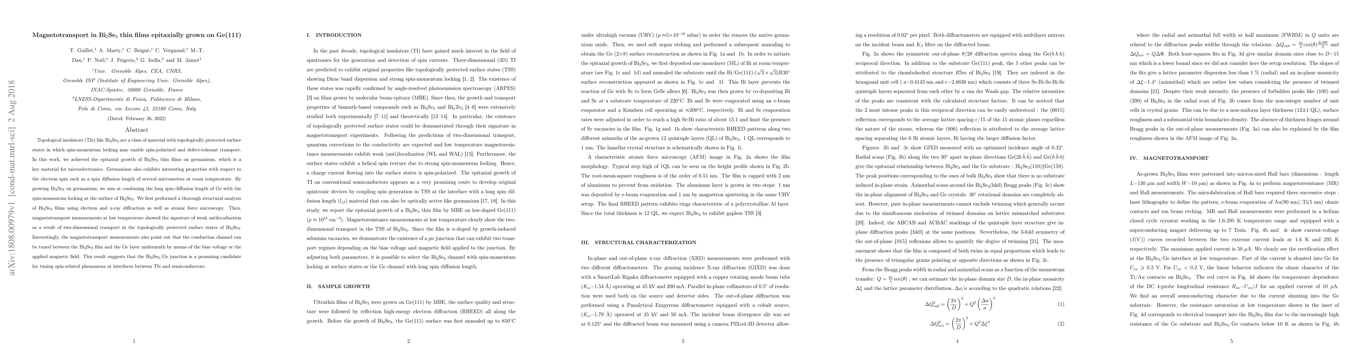 Topological insulators (TIs) like Bi$_2$Se$_3$ are a class of material with topologically protected surface states in which spin-momentum locking may enable spin-polarized and defect-tolerant transport. In this work, we achieved the epitaxial growth of Bi$_2$Se$_3$ thin films on germanium, which is a key material for microelectronics. Germanium also exhibits interesting properties with respect to the electron spin such as a spin diffusion length of several micrometers at room temperature. By growing Bi$_2$Se$_3$ on germanium, we aim at combining the long spin diffusion length of Ge with the spin-momentum locking at the surface of Bi$_2$Se$_3$. We first performed a thorough structural analysis of Bi$_2$Se$_3$ films using electron and x-ray diffraction as well as atomic force microscopy. Then, magnetotransport measurements at low temperature showed the signature of weak antilocalization as a result of two-dimensional transport in the topologically protected surface states of Bi$_2$Se$_3$. Interestingly, the magnetotransport measurements also point out that the conduction channel can be tuned between the Bi$_2$Se$_3$ film and the Ge layer underneath by means of the bias voltage or the applied magnetic field. This result suggests that the Bi$_2$Se$_3$/Ge junction is a promising candidate for tuning spin-related phenomena at interfaces between TIs and semiconductors.