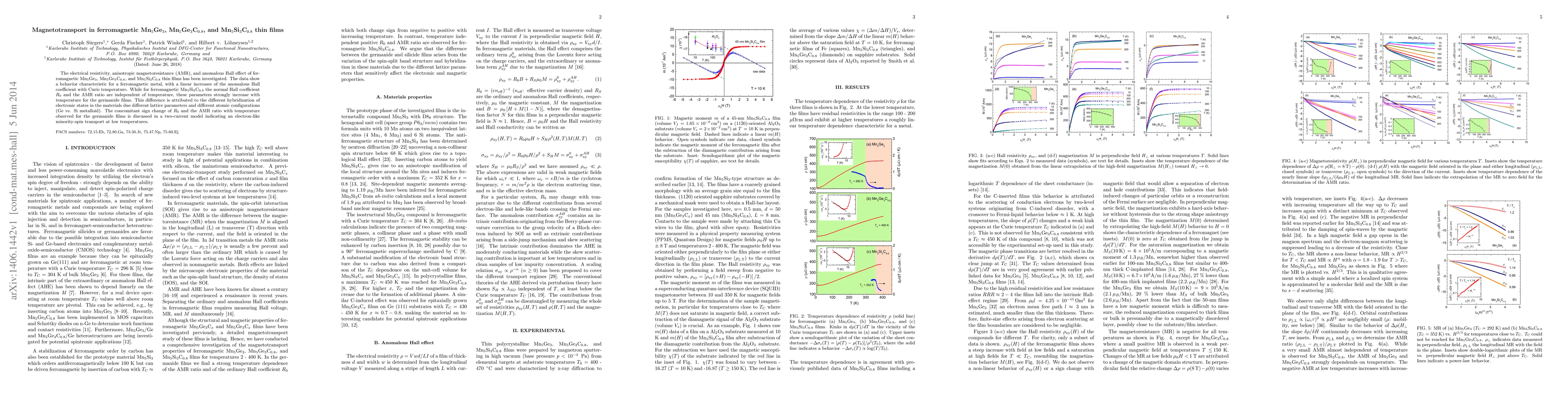 The electrical resistivity, anisotropic magnetoresistance (AMR), and anomalous Hall effect of ferromagnetic Mn5Ge3, Mn5Ge3C0.8, and Mn5Si3C0.8 thin films has been investigated. The data show a behavior characteristic for a ferromagnetic metal, with a linear increase of the anomalous Hall coefficient with Curie temperature. While for ferromagnetic Mn5Si3C0.8 the normal Hall coefficient R0 and the AMR ratio are independent of temperature, these parameters strongly increase with temperature for the germanide films. This difference is attributed to the different hybridization of electronic states in the materials due different lattice parameters and different atomic configurations (Ge vs. Si metalloid). The concomitant sign change of R0 and the AMR ratio with temperature observed for the germanide films is discussed in a two-current model indicating an electron-like minority-spin transport at low temperatures.