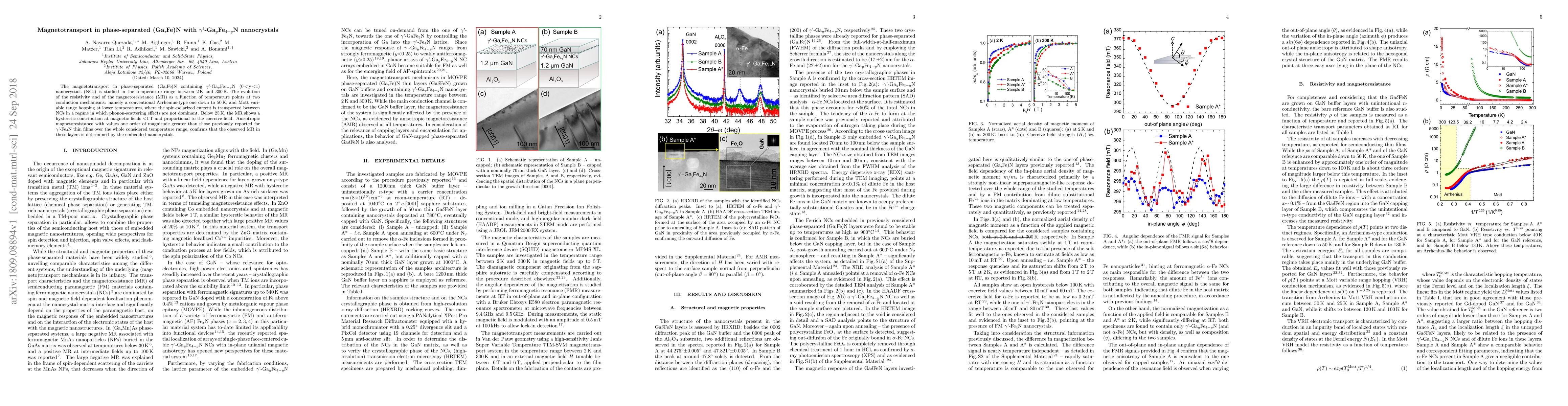 This study investigates the magnetotransport in phase-separated (Ga,Fe)N with $\gamma$'-Ga$_y$Fe$_{4-y}$N nanocrystals, revealing two conduction mechanisms: conventional Arrhenius-type up to 50 K and Mott variable range hopping below. The material exhibits significant anisotropic magnetoresistance, especially below 25 K.
