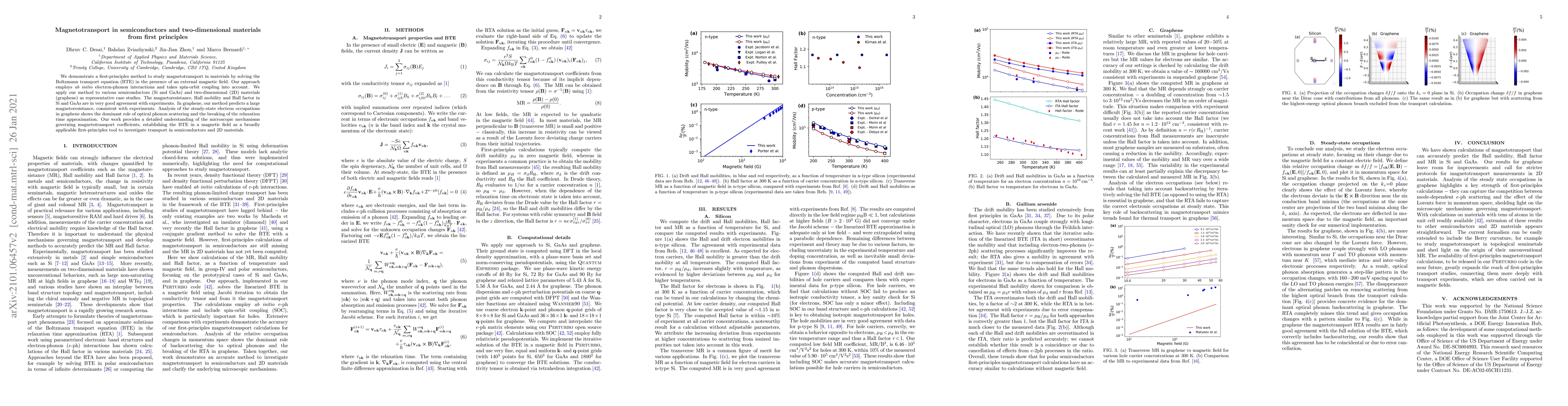 The research employs a first-principles method to study magnetotransport in materials by solving the Boltzmann transport equation (BTE) in the presence of an external magnetic field. It considers ab initio electron-phonon interactions and spin-orbit coupling, applying the method to semiconductors (Si and GaAs) and 2D materials (graphene).