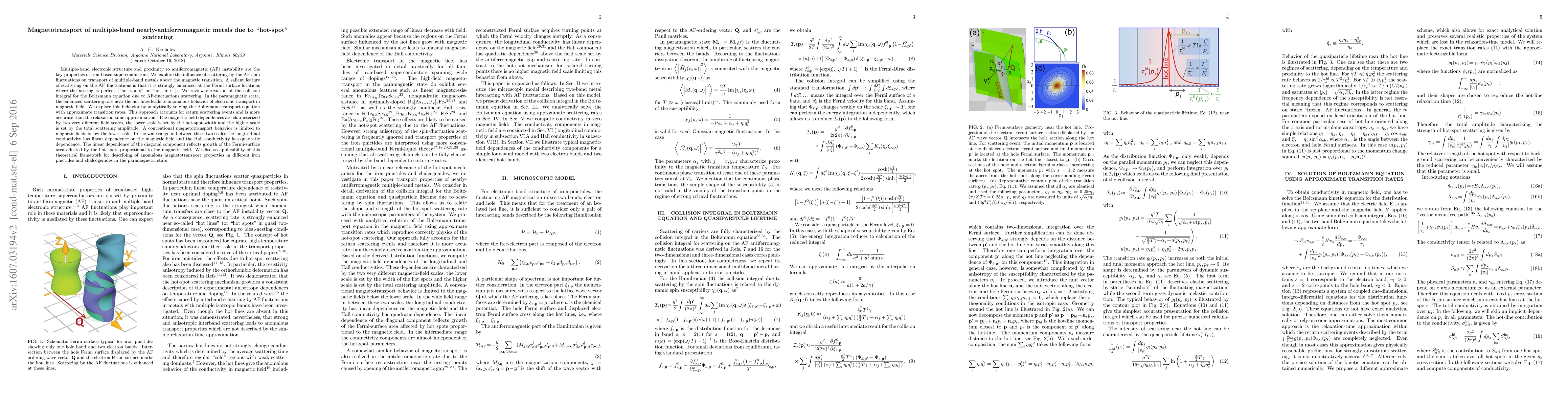 Multiple-band electronic structure and proximity to antiferromagnetic (AF) instability are the key properties of iron-based superconductors. We explore the influence of scattering by the AF spin fluctuations on transport of multiple-band metals above the magnetic transition. A salient feature of scattering on the AF fluctuations is that it is strongly enhanced at the Fermi surface locations where the nesting is perfect ("hot spots" or "hot lines"). We review derivation of the collision integral for the Boltzmann equation due to AF-fluctuations scattering. In the paramagnetic state, the enhanced scattering rate near the hot lines leads to anomalous behavior of electronic transport in magnetic field. We explore this behavior by analytically solving Boltzmann transport equation with approximate transition rates. This approach accounts for return scattering events and is more accurate than the relaxation-time approximation. The magnetic-field dependences are characterized by two very different field scales, the lower scale is set by the hot-spot width and the higher scale is set by the total scattering amplitude. A conventional magnetotransport behavior is limited to magnetic fields below the lower scale. In the wide range in between these two scales the longitudinal conductivity has linear dependence on the magnetic field and the Hall conductivity has quadratic dependence. The linear dependence of the diagonal component reflects growth of the Fermi-surface area affected by hot spots proportional to the magnetic field. We discuss applicability of this theoretical framework for describing of anomalous magnetotransport properties in different iron pnictides and selenides in the paramagnetic state.