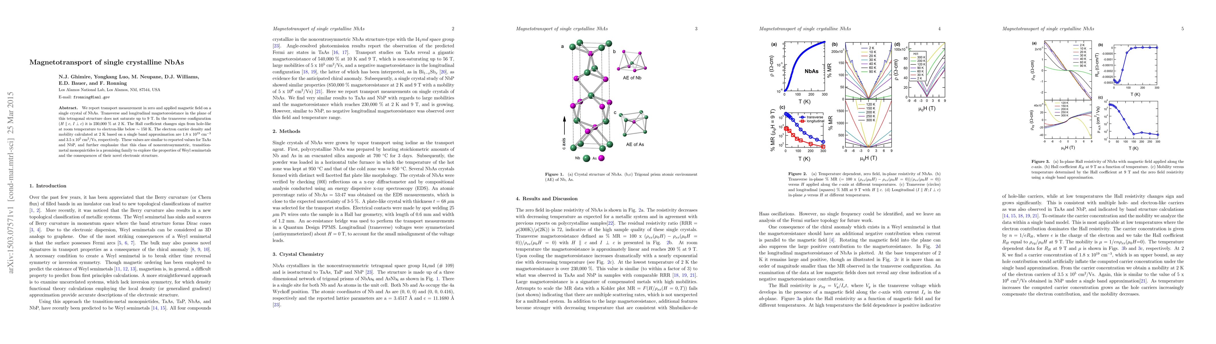 The research examines single crystalline NbAs, finding its transverse magnetoresistance reaches 230,000% at 2K under a 9T magnetic field, with a sign change in Hall coefficient from hole-like to electron-like below 150K. At 2K, the electron carrier density and mobility are determined to be 1.8 x 10^19 cm^-3 and 3.5 x 10^5 cm^2/Vs, respectively, placing NbAs in a promising class of materials for Weyl semimetal studies.