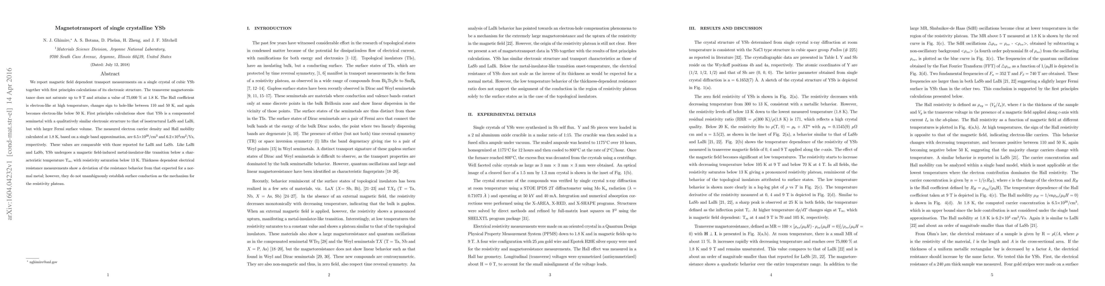 Researchers studied magnetotransport in single-crystal YSb, finding it exhibits a high magnetoresistance of 75,000% at low temperatures, with a metal-insulator-like transition occurring below a characteristic temperature.