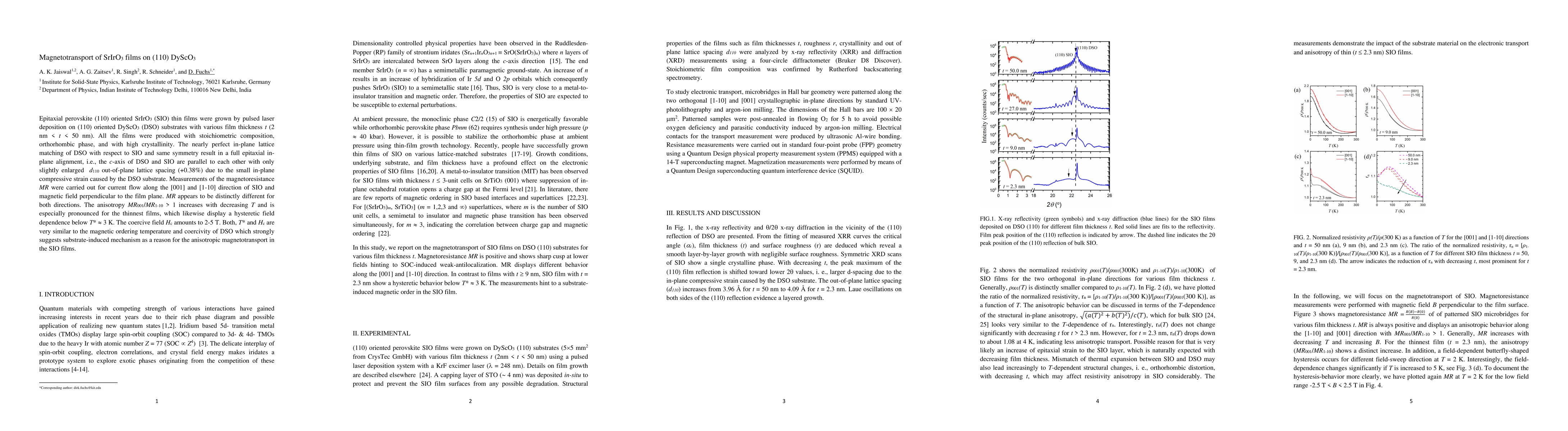 Epitaxial perovskite (110) oriented SrIrO3 (SIO) thin films were grown by pulsed laser deposition on (110) oriented DyScO3 (DSO) substrates with various film thickness t (2 nm < t < 50 nm). All the films were produced with stoichiometric composition, orthorhombic phase, and with high crystallinity. The nearly perfect in-plane lattice matching of DSO with respect to SIO and same symmetry result in a full epitaxial inplane alignment, i.e., the c-axis of DSO and SIO are parallel to each other with only slightly enlarged d110 out-of-plane lattice spacing (+0.38%) due to the small in-plane compressive strain caused by the DSO substrate. Measurements of the magnetoresistance MR were carried out for current flow along the [001] and [1-10] direction of SIO and magnetic field perpendicular to the film plane. MR appears to be distinctly different for both directions. The anisotropy MR001/MR1-10 > 1 increases with decreasing T and is especially pronounced for the thinnest films, which likewise display a hysteretic field dependence below T* ~ 3 K. The coercive field Hc amounts to 2-5 T. Both, T* and Hc are very similar to the magnetic ordering temperature and coercivity of DSO which strongly suggests substrate-induced mechanism as a reason for the anisotropic magnetotransport in the SIO films.