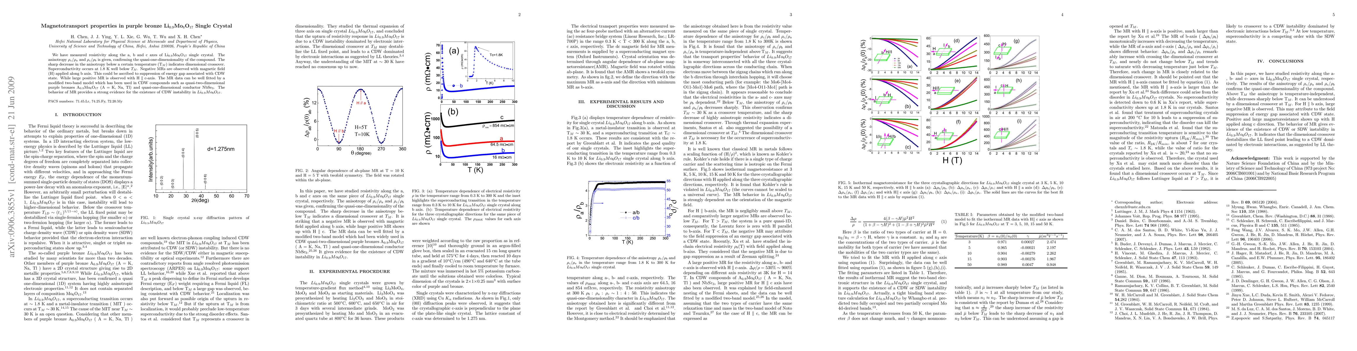 We have measured resistivity along the a, b and c axes of Li$_{0.9}$Mo$_6$O$_{17}$ single crystal. The anisotropy $\rho$$_c$ / $\rho$$_a$ and $\rho$$_c$ / $\rho$$_b$ is given, confirming the quasi-one-dimensionality of the compound. The sharp decrease in the anisotropy below a certain temperature (T$_M$) indicates dimensional crossover. Superconductivity occurs at 1.8 K well below $T_M$. Negative MRs are observed with magnetic field (H) applied along b axis. This could be ascribed to suppression of energy gap associated with CDW state. While large positive MR is observed with H $\parallel$ c-axis. The MR data can be well fitted by a modified two-band model which has been used in CDW compounds such as quasi-two-dimensional purple bronzes A$_{0.9}$Mo$_6$O$_{17}$ (A = K, Na, Tl) and quasi-one-dimensional conductor NbSe$_3$. The behavior of MR provides a strong evidence for the existence of CDW instability in $Li_{0.9}Mo_6O_{17}$.