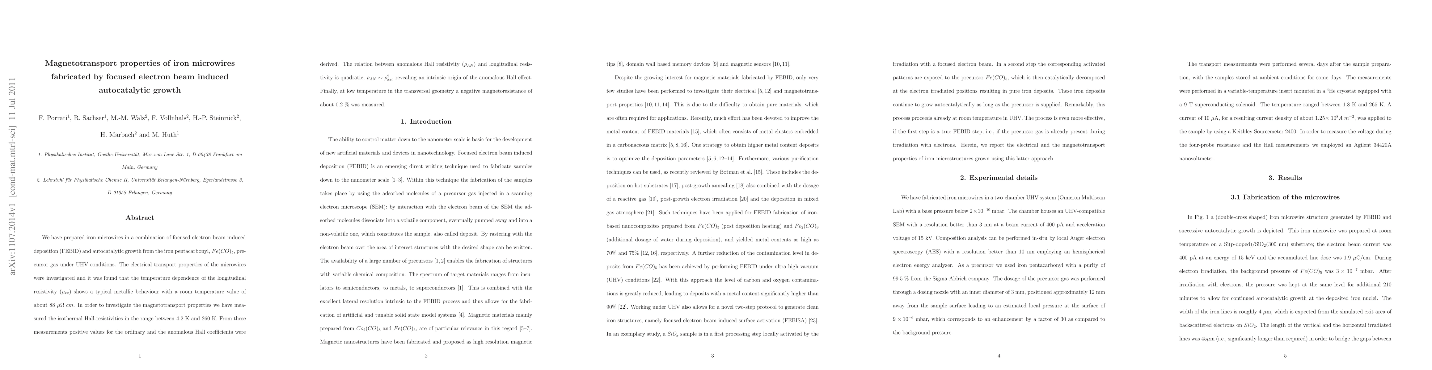 We have prepared iron microwires in a combination of focused electron beam induced deposition (FEBID) and autocatalytic growth from the iron pentacarbonyl, Fe(CO)5, precursor gas under UHV conditions. The electrical transport properties of the microwires were investigated and it was found that the temperature dependence of the longitudinal resistivity (rhoxx) shows a typical metallic behaviour with a room temperature value of about 88 micro{\Omega} cm. In order to investigate the magnetotransport properties we have measured the isothermal Hall-resistivities in the range between 4.2 K and 260 K. From these measurements positive values for the ordinary and the anomalous Hall coefficients were derived. The relation between anomalous Hall resistivity (rhoAN) and longitudinal resistivity is quadratic, rhoAN rho^2 xx, revealing an intrinsic origin of the anomalous Hall effect. Finally, at low temperature in the transversal geometry a negative magnetoresistance of about 0.2 % was measured.