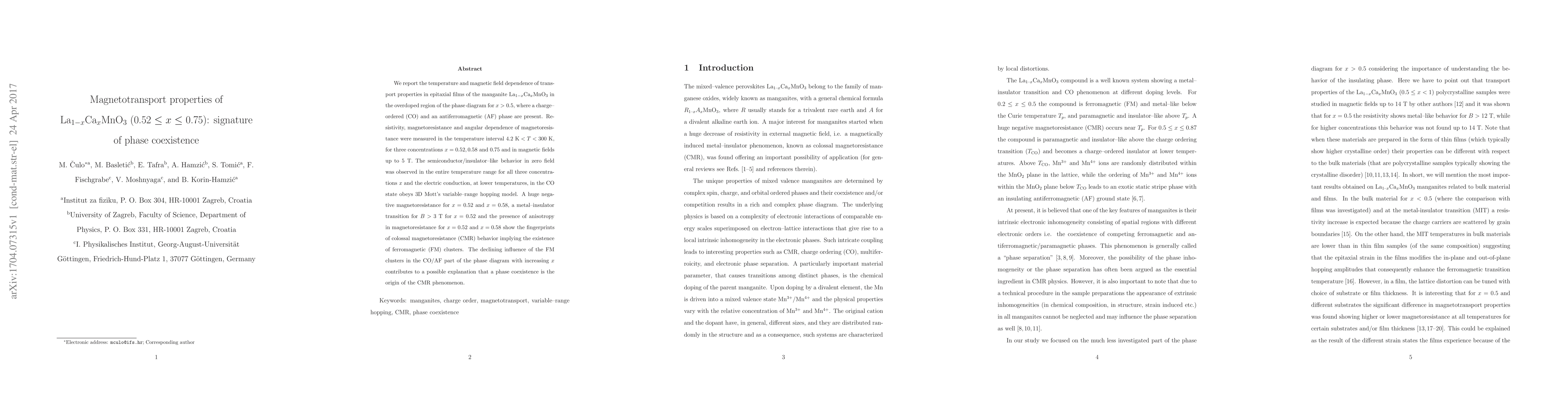 We report the temperature and magnetic field dependence of transport properties in epitaxial films of the manganite La$_{1-x}$Ca$_{x}$MnO$_{3}$ in the overdoped region of the phase diagram for $x > 0.5$, where a charge--ordered (CO) and an antiferromagnetic (AF) phase are present. Resistivity, magnetoresistance and angular dependence of magnetoresistance were measured in the temperature interval $4.2 ~\mathrm{K} < T < 300 ~\mathrm{K}$, for three concentrations $x = 0.52, 0.58$ and $0.75$ and in magnetic fields up to 5 T. The semiconductor/insulator--like behavior in zero field was observed in the entire temperature range for all three concentrations \textit{x} and the electric conduction, at lower temperatures, in the CO state obeys 3D Mott's variable--range hopping model. A huge negative magnetoresistance for $x = 0.52$ and $x = 0.58$, a metal--insulator transition for $B > 3 ~\mathrm{T}$ for $x = 0.52$ and the presence of anisotropy in magnetoresistance for $x = 0.52$ and $x = 0.58$ show the fingerprints of colossal magnetoresistance (CMR) behavior implying the existence of ferromagnetic (FM) clusters. The declining influence of the FM clusters in the CO/AF part of the phase diagram with increasing $x$ contributes to a possible explanation that a phase coexistence is the origin of the CMR phenomenon.