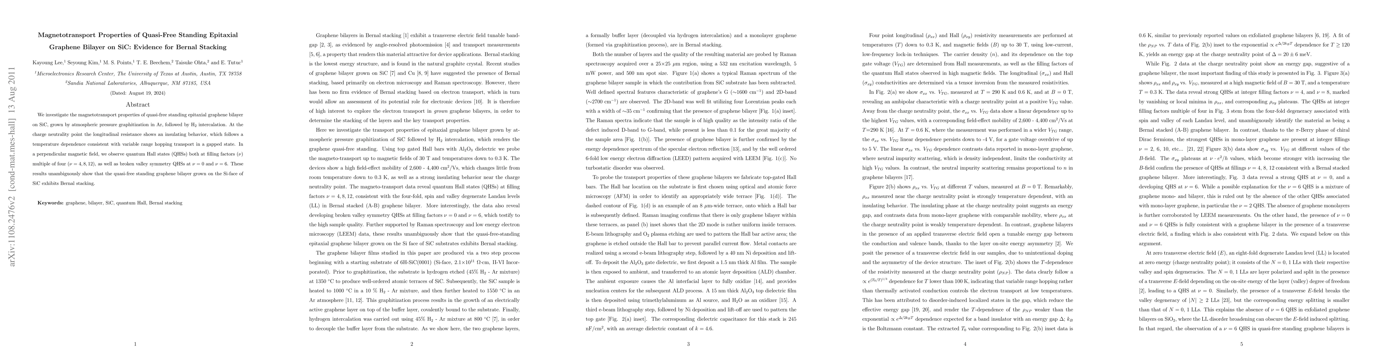 Summary: This study explores the magnetotransport properties of a quasi-free standing epitaxial graphene bilayer on SiC, revealing insulating behavior at the charge neutrality point and quantum Hall states at specific filling factors, confirming the Bernal stacking configuration of the graphene bilayer.