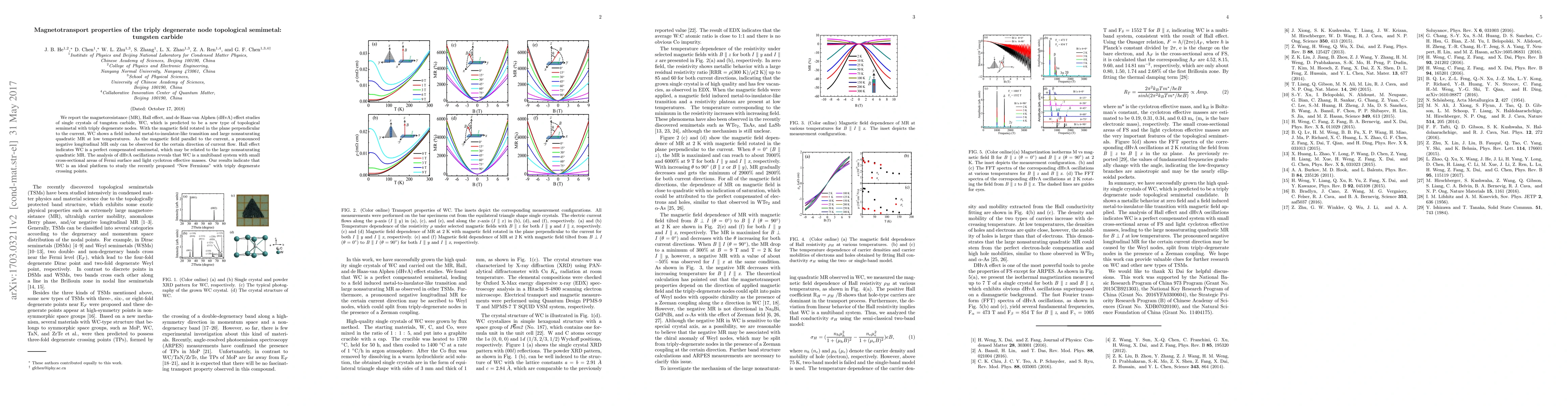 This study investigates the magnetotransport properties of tungsten carbide (WC), a predicted topological semimetal with triply degenerate nodes. WC exhibits a metal-to-insulator transition and large quadratic magnetoresistance under perpendicular magnetic fields, while showing pronounced negative longitudinal magnetoresistance under parallel fields. The findings suggest WC is a multiband system with small Fermi surface cross-sectional areas and light cyclotron effective masses, making it a suitable platform for studying New Fermions.