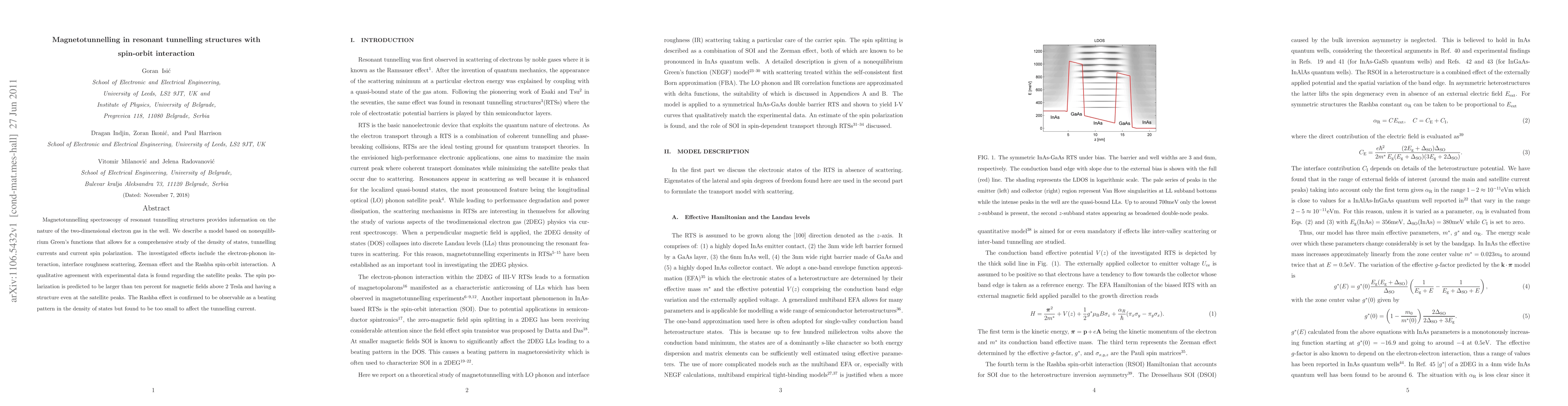 This paper models magnetotunnelling in resonant tunnelling structures, incorporating spin-orbit interaction, to study the effects of electron-phonon interaction, interface roughness, and Zeeman effect on the density of states and tunnelling currents. The model predicts significant spin polarization above 2 Tesla and confirms the observable but minor effect of the Rashba spin-orbit interaction.