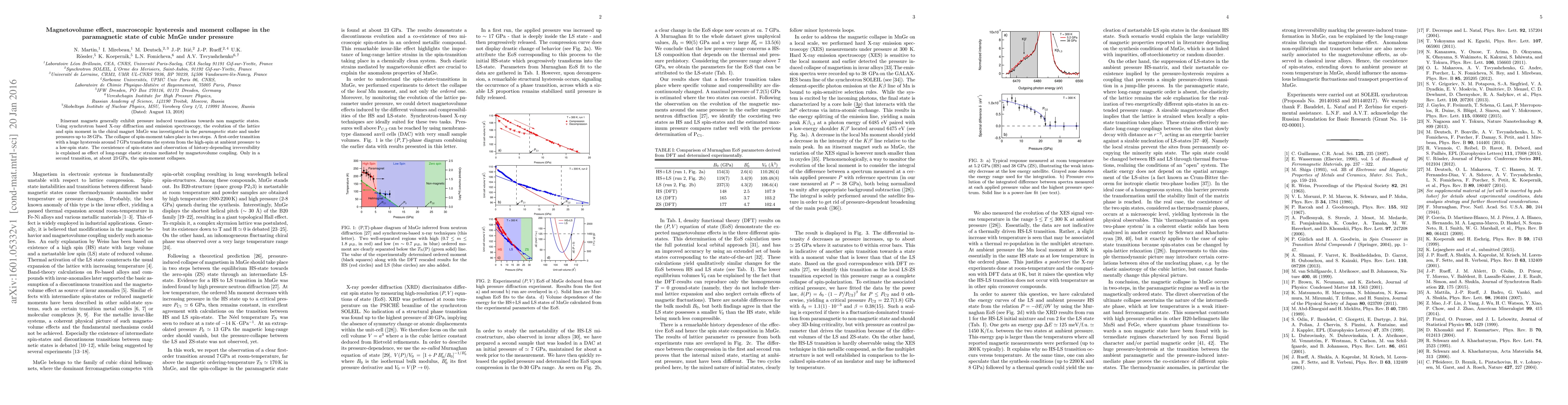 Itinerant magnets generally exhibit pressure induced transitions towards non magnetic states. Using synchrotron based X-ray diffraction and emission spectroscopy, the evolution of the lattice and spin moment in the chiral magnet MnGe was investigated in the paramagnetic state and under pressures up to 38 GPa. The collapse of spin-moment takes place in two steps. A first-order transition with a huge hysteresis around 7 GPa transforms the system from the high-spin at ambient pressure to a low-spin state. The coexistence of spin-states and observation of history-depending irreversibility is explained as effect of long-range elastic strains mediated by magnetovolume coupling. Only in a second transition, at about 23 GPa, the spin-moment collapses.