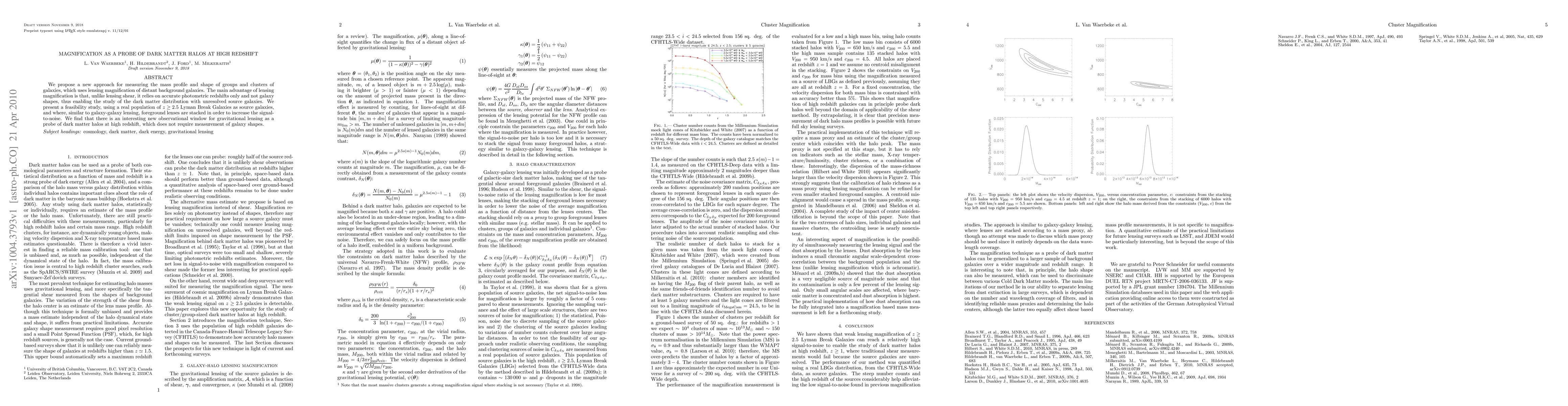We propose a new approach for measuring the mass profile and shape of groups and clusters of galaxies, which uses lensing magnification of distant background galaxies. The main advantage of lensing magnification is that, unlike lensing shear, it relies on accurate photometric redshifts only and not galaxy shapes, thus enabling the study of the dark matter distribution with unresolved source galaxies. We present a feasibility study, using a real population of z > 2.5 Lyman Break Galaxies as source galaxies, and where, similar to galaxy-galaxy lensing, foreground lenses are stacked in order to increase the signal-to-noise. We find that there is an interesting new observational window for gravitational lensing as a probe of dark matter halos at high redshift, which does not require measurement of galaxy shapes.