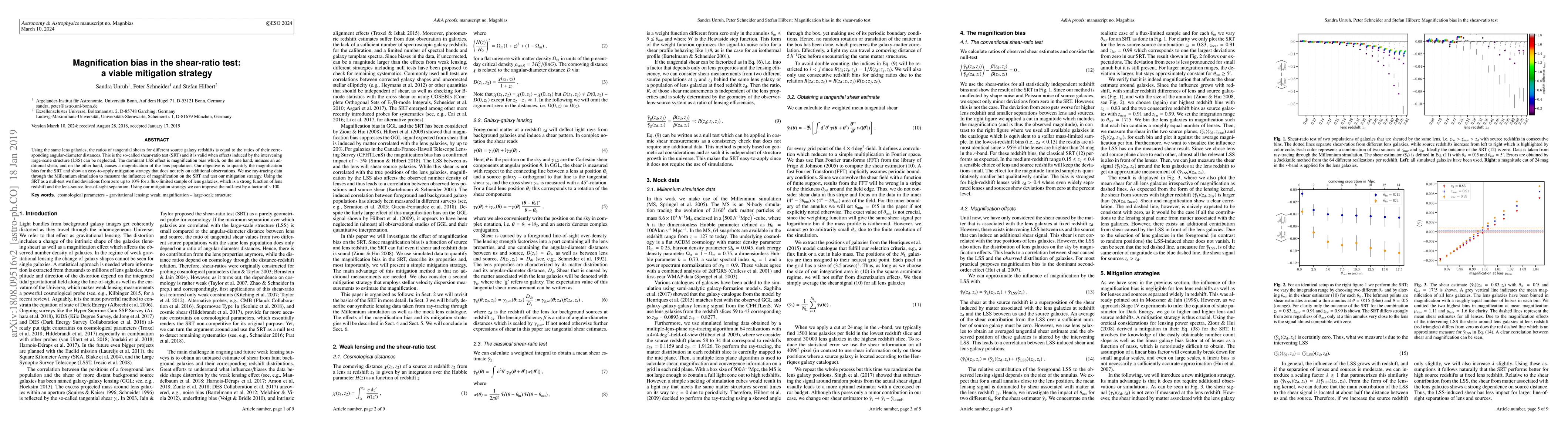 Using the same lens galaxies, the ratios of tangential shears for different source galaxy redshifts is equal to the ratios of their corresponding angular-diameter distances. This is the so-called shear-ratio test (SRT) and it is valid when effects induced by the intervening large-scale structure (LSS) can be neglected. The dominant LSS effect is magnification bias which, on the one hand, induces an additional shear, and on the other hand, causes a magnification of the lens population. Our objective is to quantify the magnification bias for the SRT and show an easy-to-apply mitigation strategy that does not rely on additional observations. We use ray-tracing data through the Millennium simulation to measure the influence of magnification on the SRT and test our mitigation strategy. Using the SRT as a null-test we find deviations from zero up to $10 \%$ for a flux-limited sample of lens galaxies, which is a strong function of lens redshift and the lens-source line-of-sight separation. Using our mitigation strategy we can improve the null-test by a factor of $\sim \!100$.