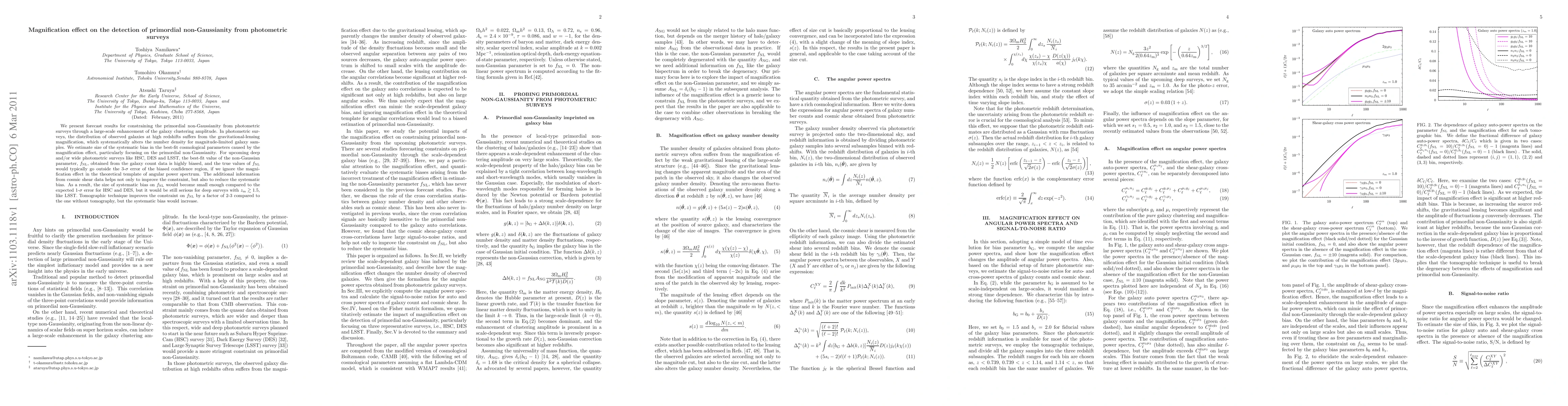 We present forecast results for constraining the primordial non-Gaussianity from photometric surveys through a large-scale enhancement of the galaxy clustering amplitude. In photometric surveys, the distribution of observed galaxies at high redshifts suffers from the gravitational-lensing magnification, which systematically alters the number density for magnitude-limited galaxy samples. We estimate size of the systematic bias in the best-fit cosmological parameters caused by the magnification effect, particularly focusing on the primordial non-Gaussianity. For upcoming deep and/or wide photometric surveys like HSC, DES and LSST, the best-fit value of the non-Gaussian parameter, fNL, obtained from the galaxy count data is highly biased, and the true values of fNL would typically go outside the 3-sigma error of the biased confidence region, if we ignore the magnification effect in the theoretical template of angular power spectrum. The additional information from cosmic shear data helps not only to improve the constraint, but also to reduce the systematic bias. As a result, the size of systematic bias on fNL would become small enough compared to the expected 1-sigma error for HSC and DES, but it would be still serious for deep surveys with z_m > 1.5, like LSST. Tomographic technique improves the constraint on fNL by a factor of 2-3 compared to the one without tomography, but the systematic bias would increase.